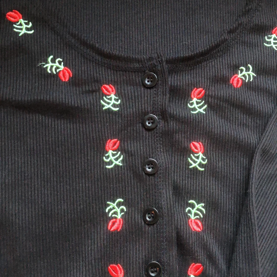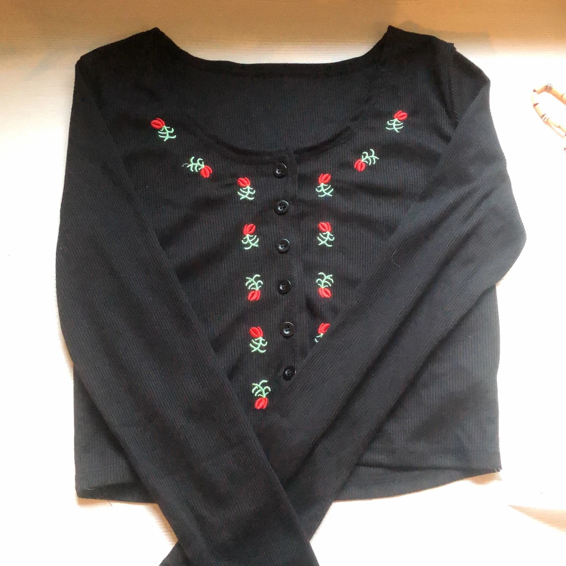 Gullig svart kofta med broderat blomm mönster. Säljer pga att den var för liten. Köparen står för frakt