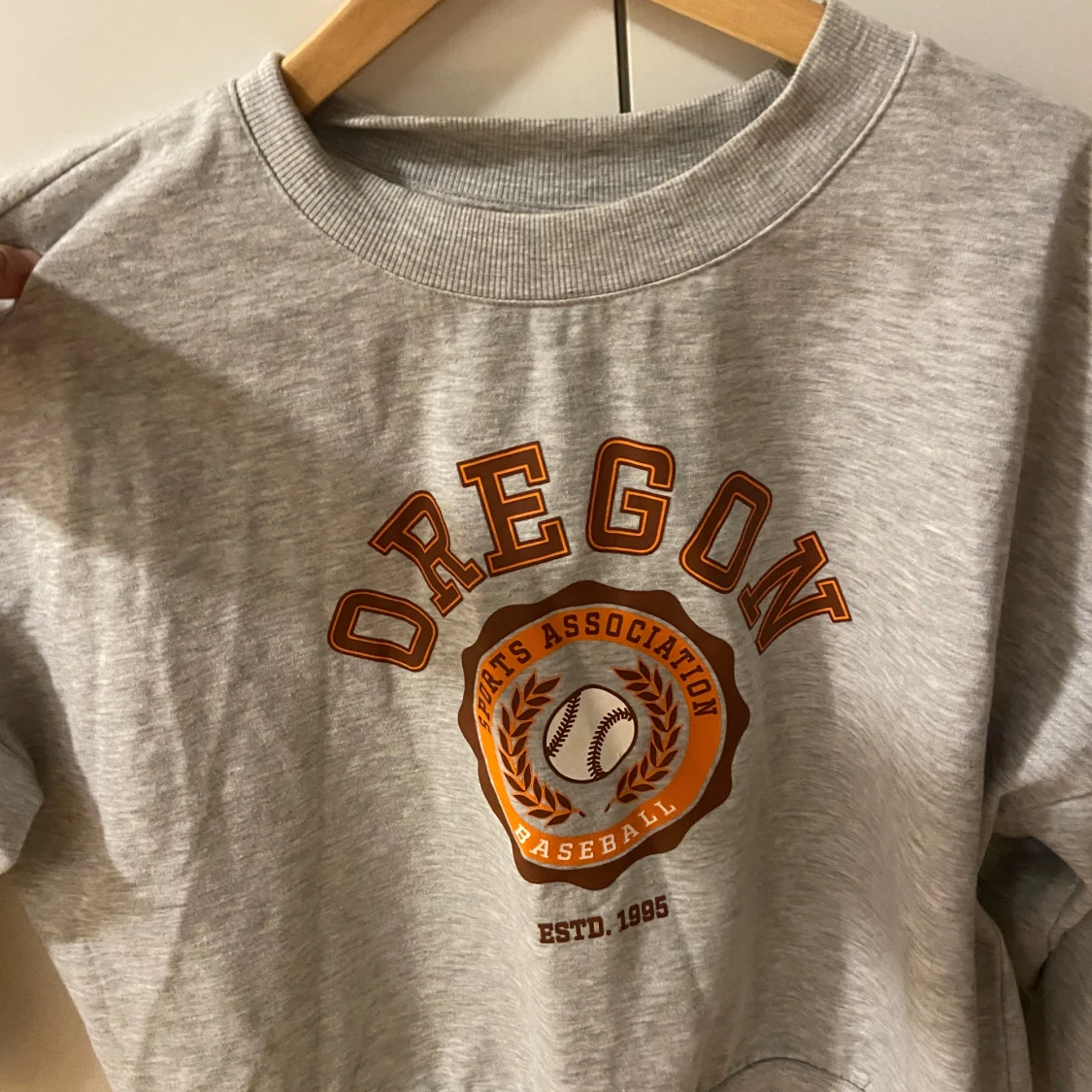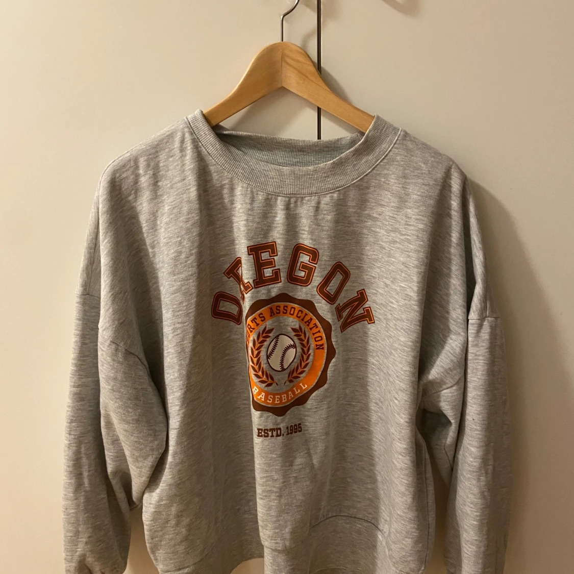 Säljer en grå sweatshirt med tryck från Oregon Sports Association. Tröjan har en rund halsringning och långa ärmar. Perfekt för en avslappnad stil.