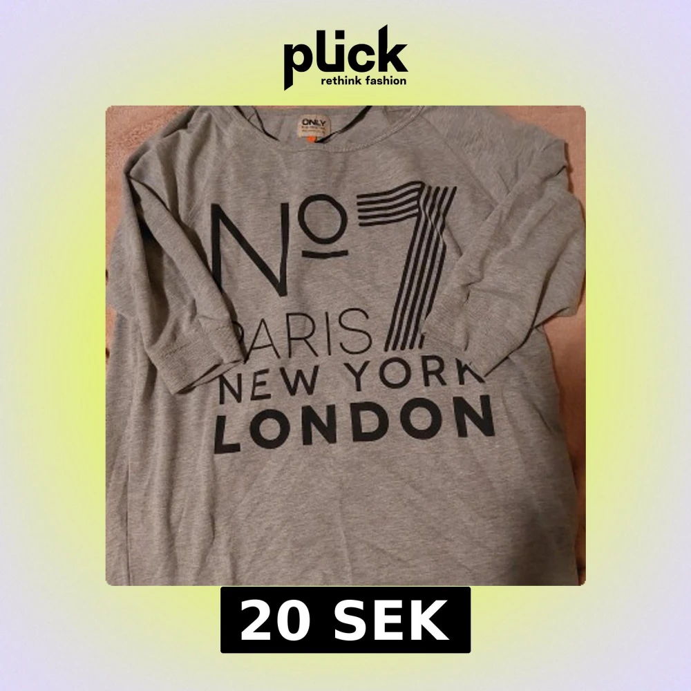 Säljer en grå tröja från ONLY med tryck av städerna Paris, New York och London. Tröjan har medel långa ärmar och en avslappnad passform. Perfekt för en casual look!