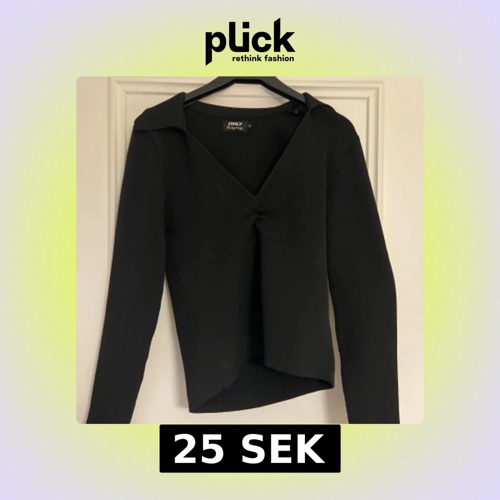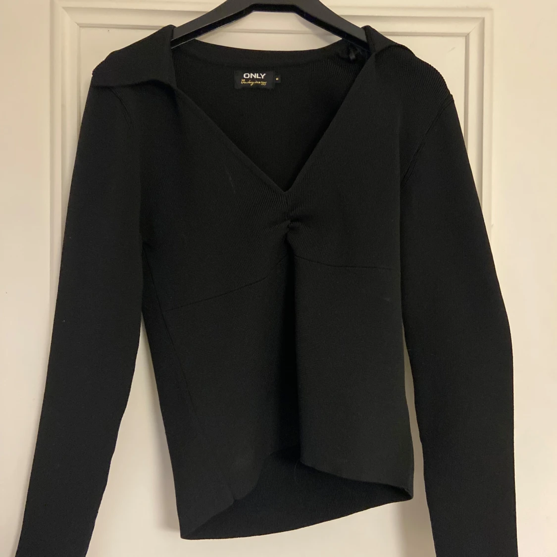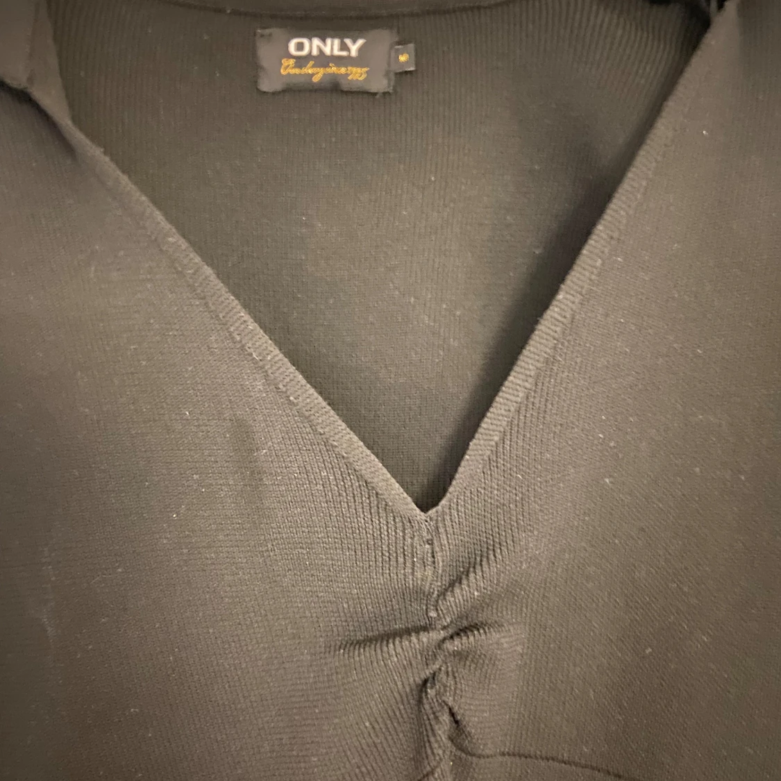 Snygg svart topp från ONLY med lång ärm och v-ringad design. Toppen har en elegant knytning framtill och en klassisk krage. Perfekt för en stilren look.