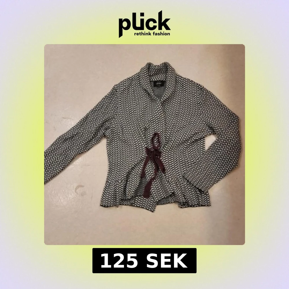 Säljer en svartvit mönstrad kofta från Only med vågigt mönster och snyggt knytband i midjan. Koftan har lång ärm och en skön, mjuk känsla. Perfekt för lager-på-lager och att slänga över en topp.