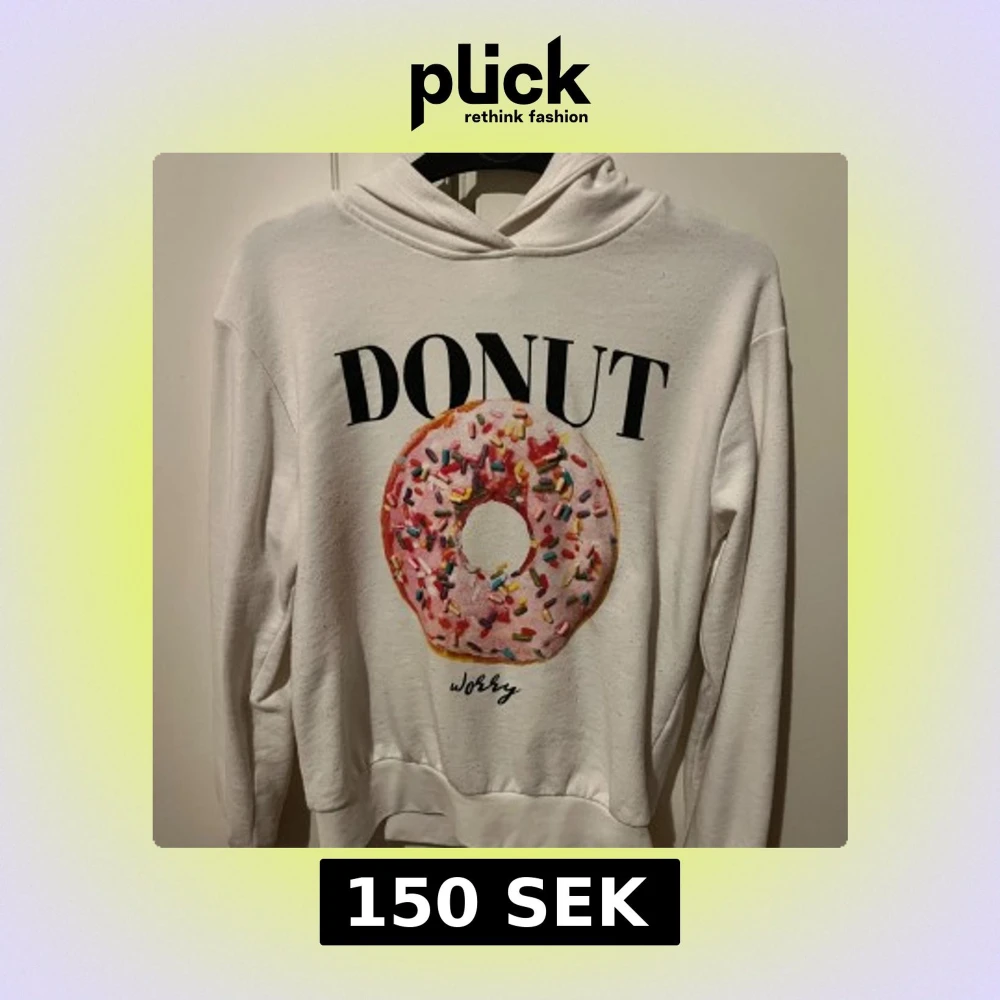 Vit hoodie från ONLY i storlek S med stort färgglatt donut-tryck och texten 'DONUT WORRY' på framsidan. Tröjan har huva, långa ärmar och är gjord i mjuk bomull. Perfekt för dig som gillar roliga prints och chill stil.