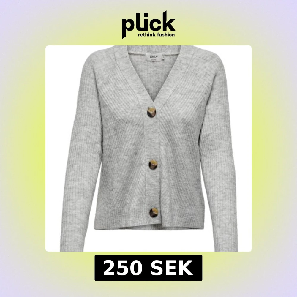 Säljer en stilren grå kofta från ONLY med knappar framtill. Koftan är ribbad och har en v-ringad design med långa ärmar. Perfekt för en avslappnad look.