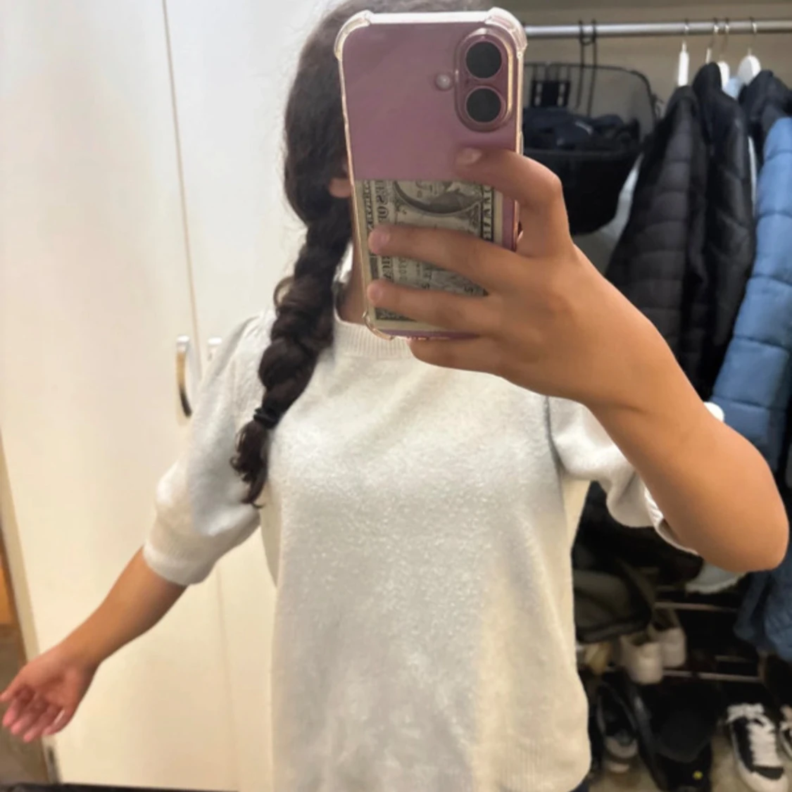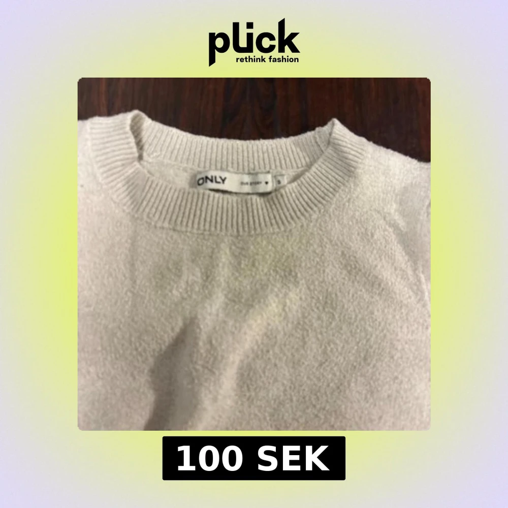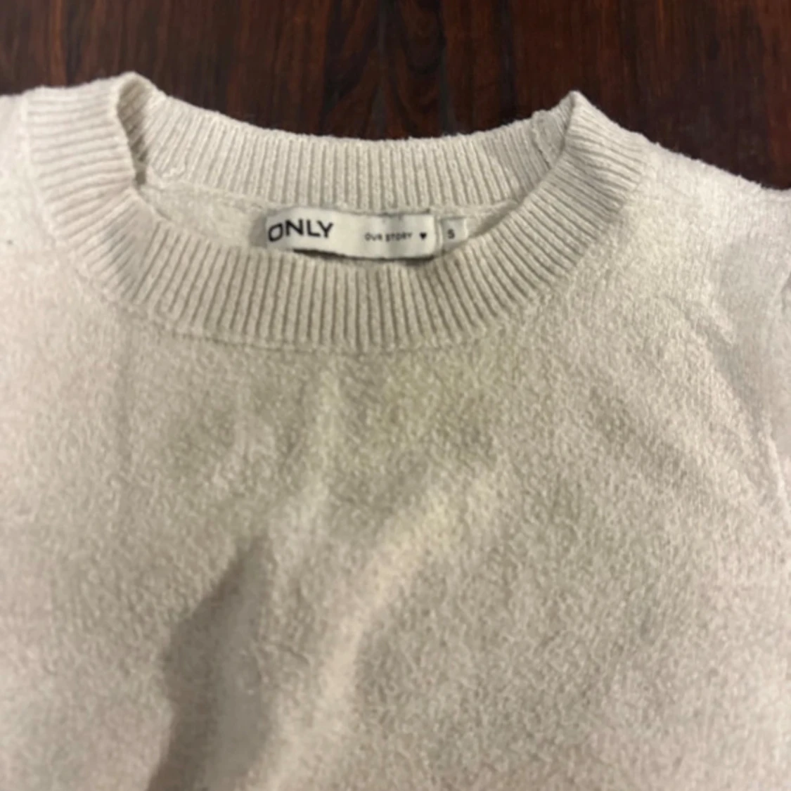 Säljer en vit stickad tröja från ONLY med rund hals och ribbade muddar. Tröjan har en enkel och clean look med korta ärmar som ger en fräsch vibe. Perfekt för dig som gillar stilrena plagg och vill ha något som funkar till många outfits.