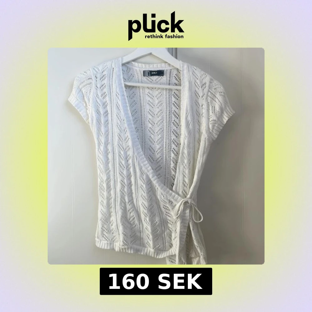 Säljer en söt vit omlottkofta från ONLY med korta ärmar och knytband i midjan. Koftan har ett fint spetsmönster. Perfekt för lager-på-lager-stil!