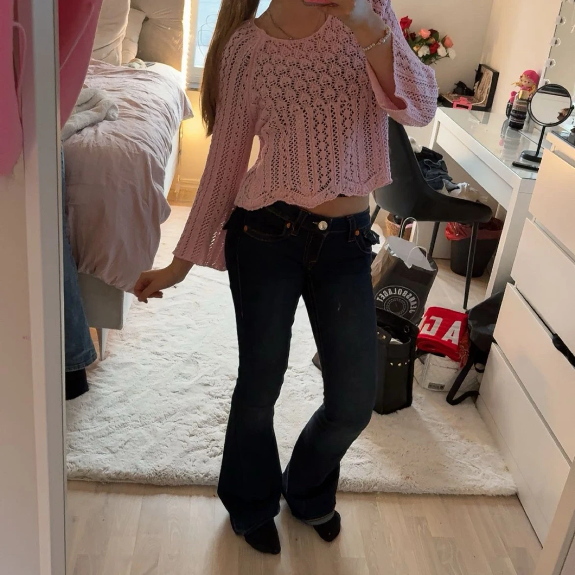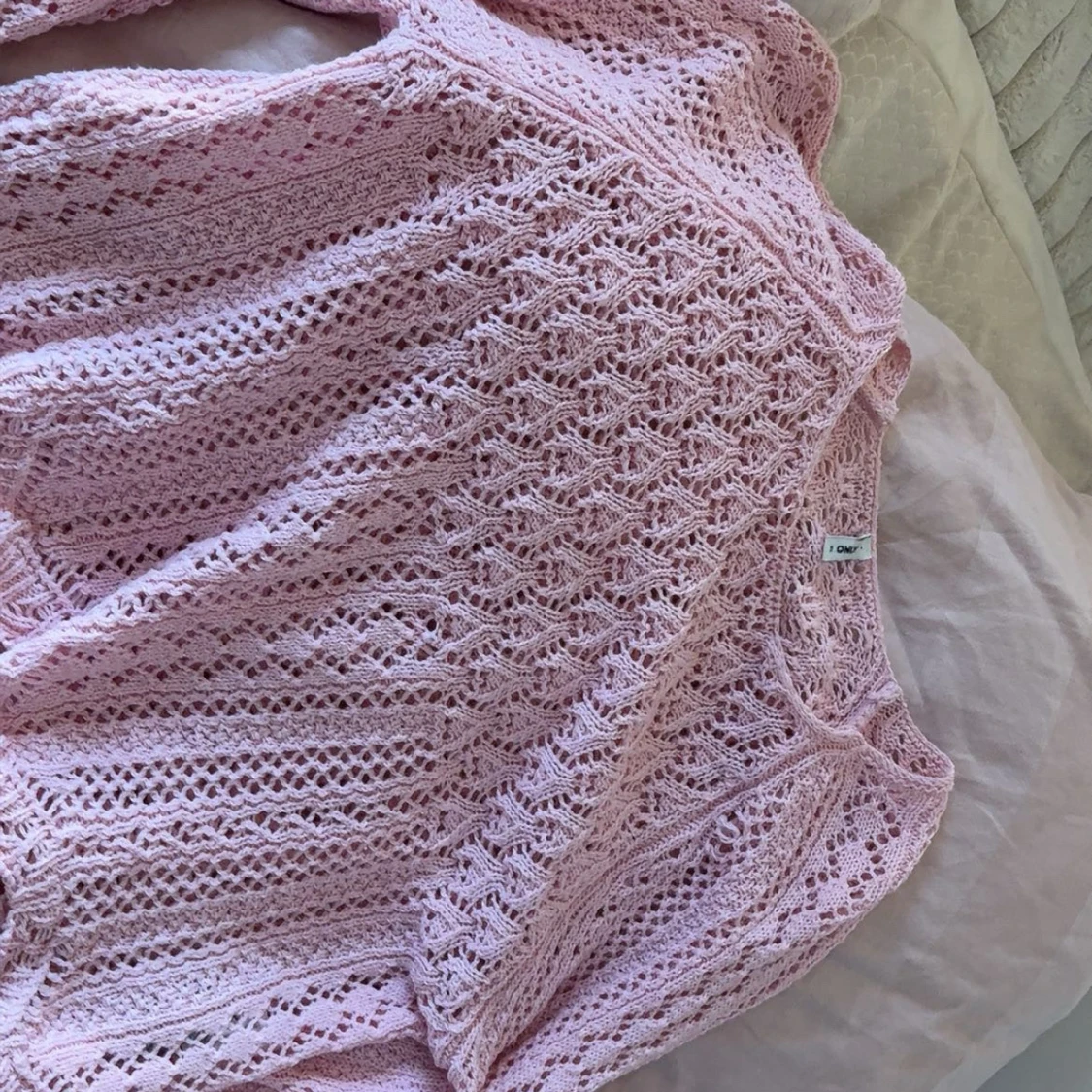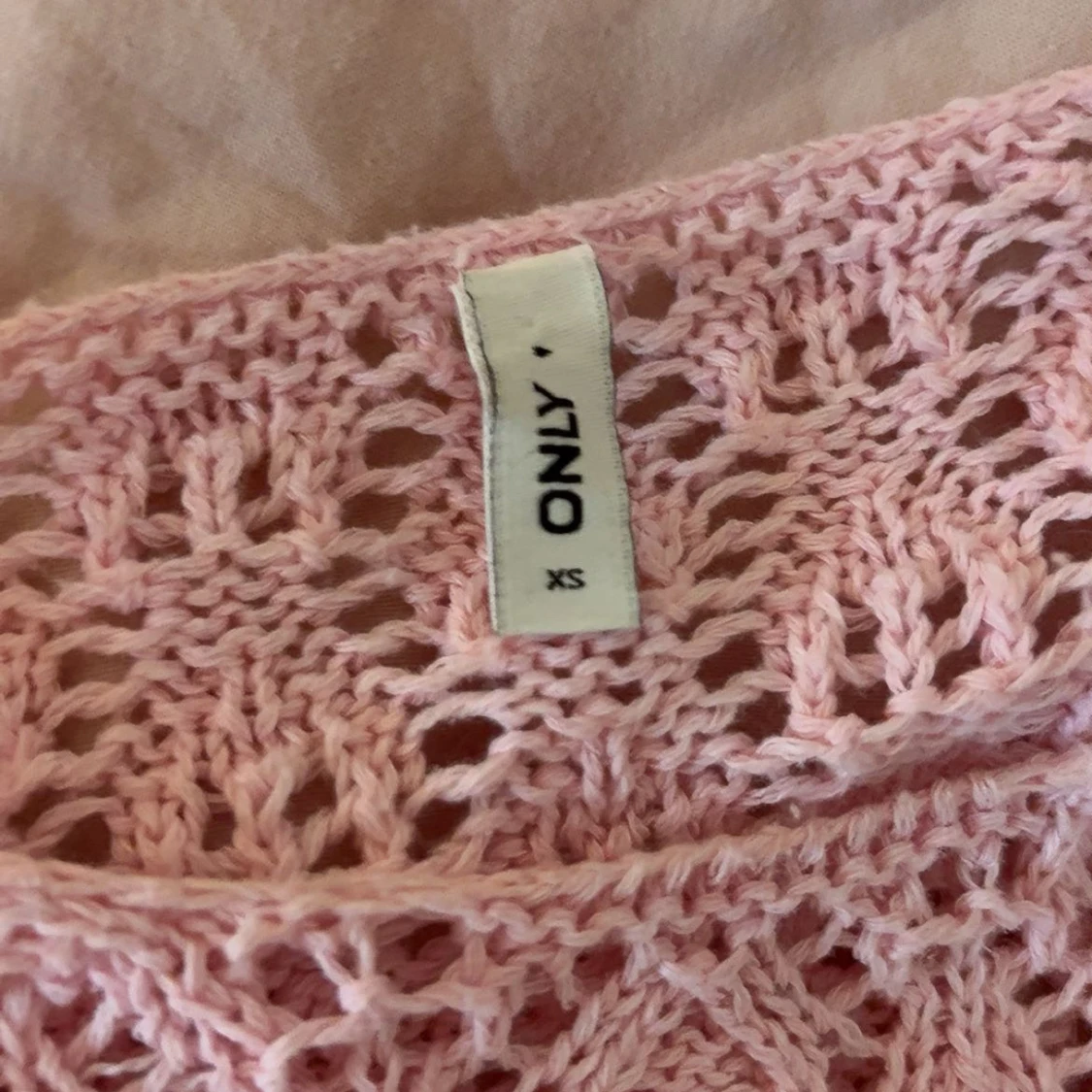 Supersöt ljusrosa stickad tröja från ONLY med croppad passform och vida ärmar. Tröjan har ett snyggt virkat mönster och rund halsringning, perfekt för vår och sommar. Passar dig som gillar en feminin och trendig stil. Aldrig använt