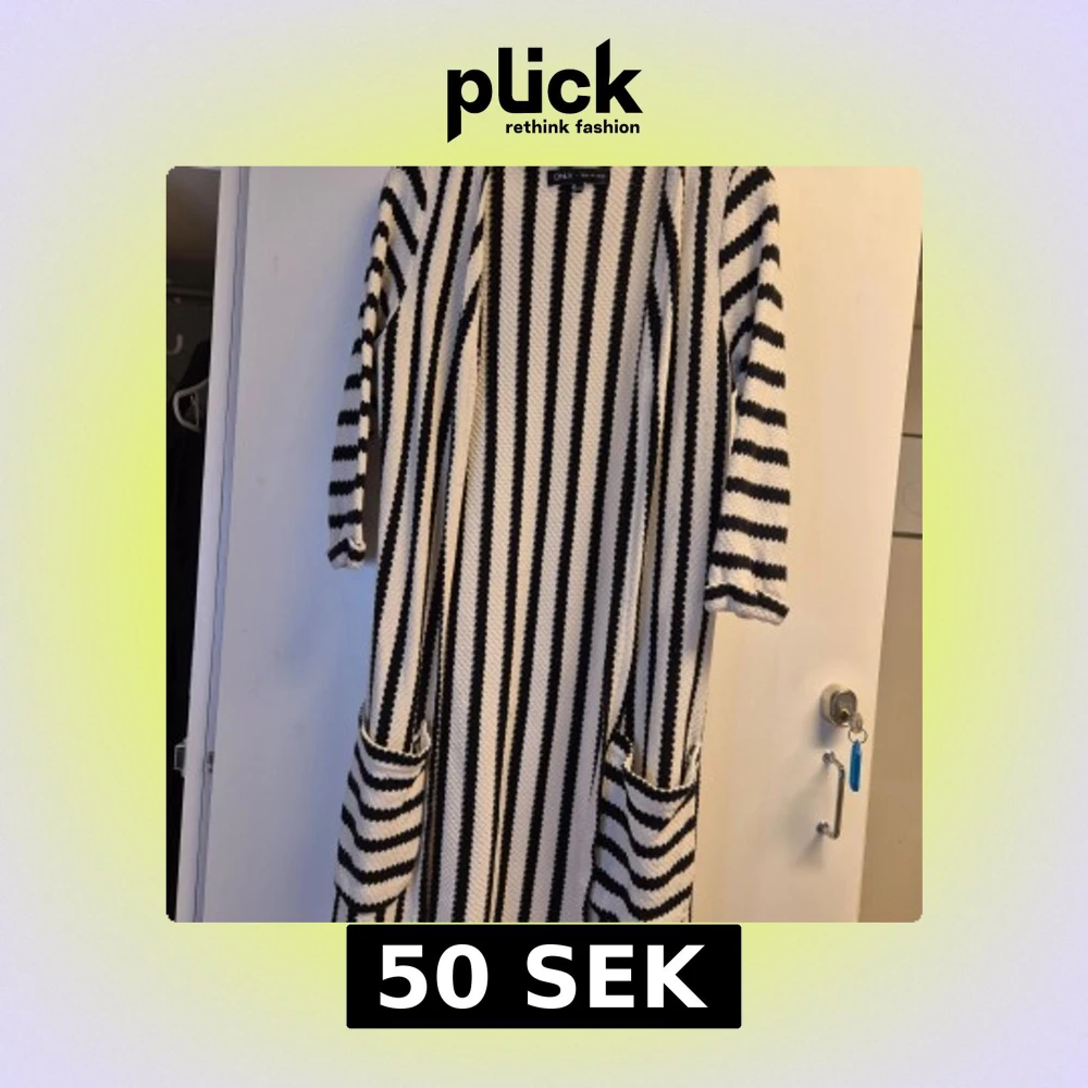 Säljer en lång och mysig randig kofta från ONLY i svart och vit. Koftan har långa ärmar och praktiska fickor framtill. Perfekt för kyliga dagar!