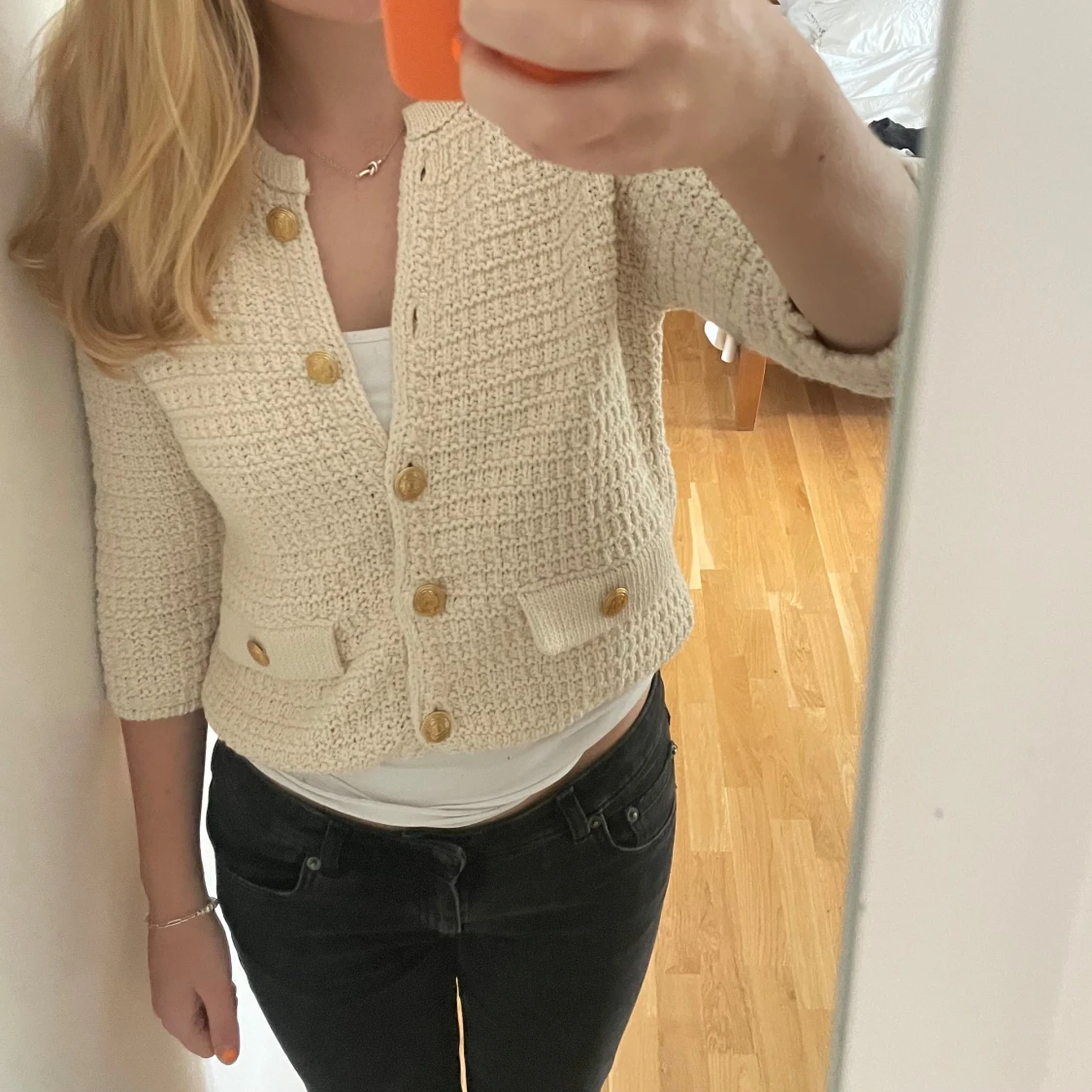 Superfin beige stickad cardigan jacka med guldiga knappar och två små fickor framtill samt trekvarts ärmar. Jättefin och trendig. Köparen står för frakt