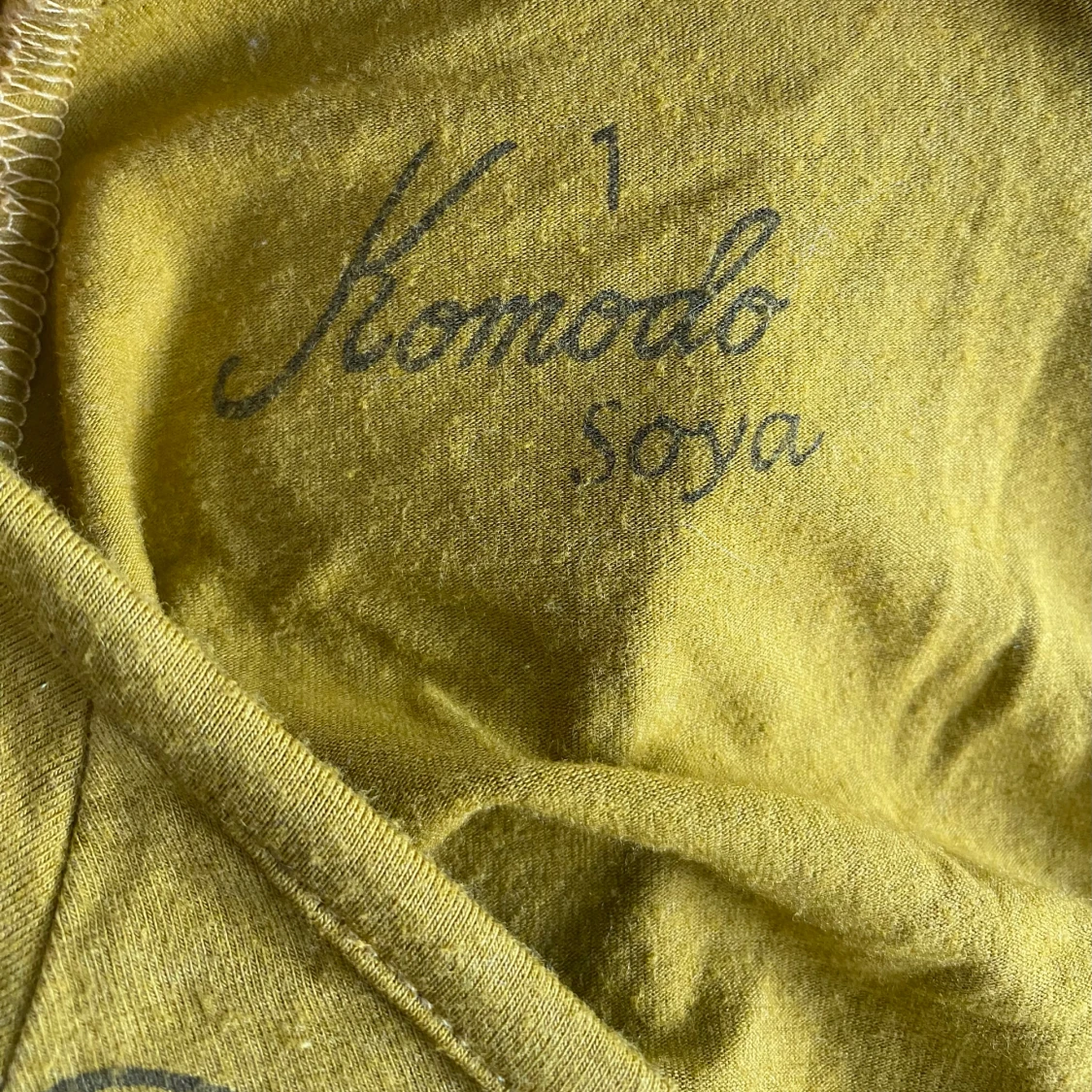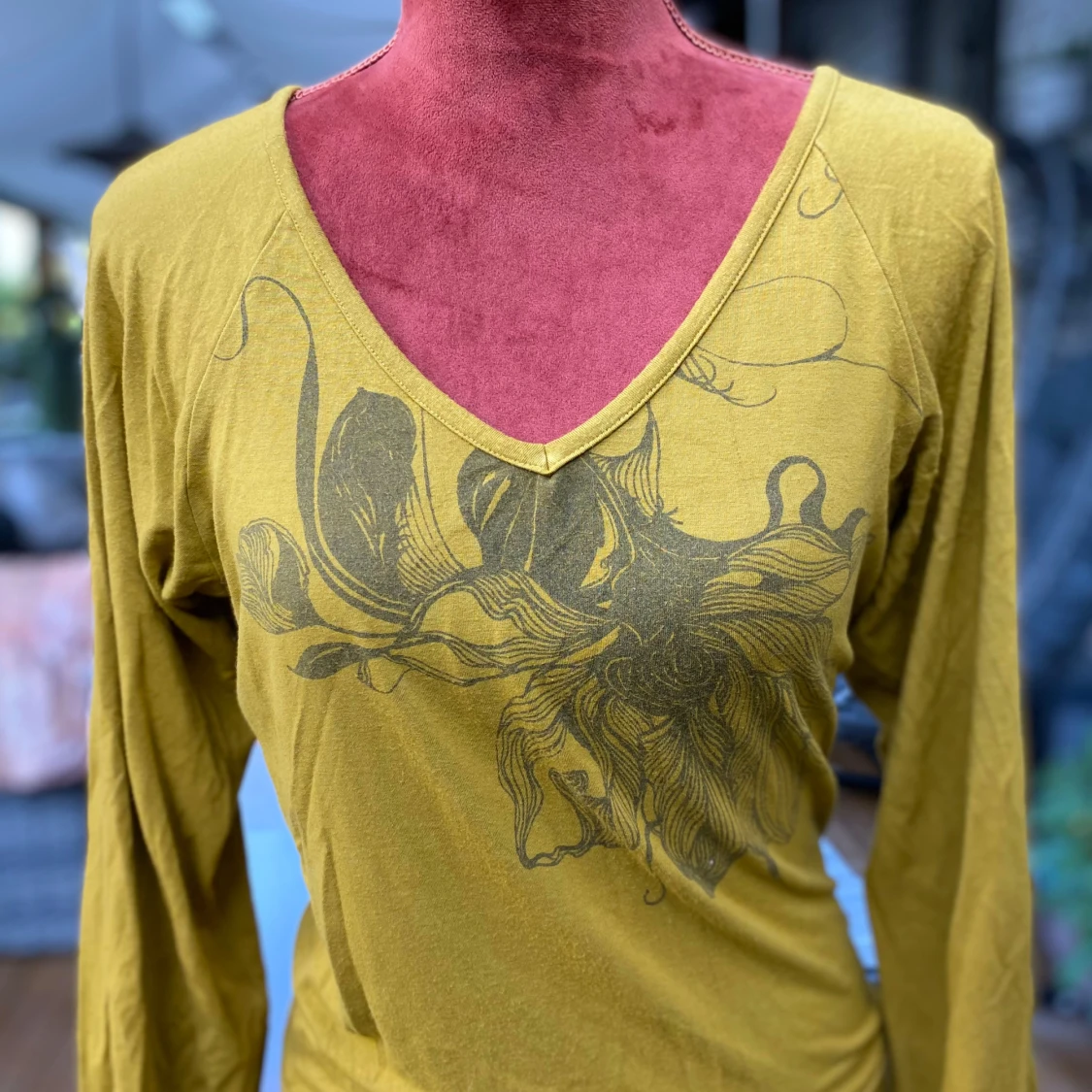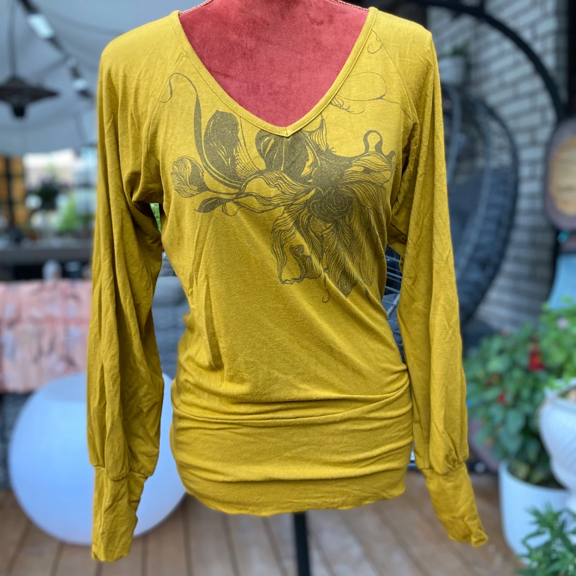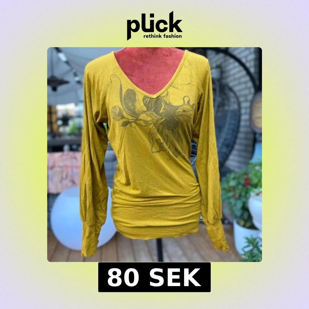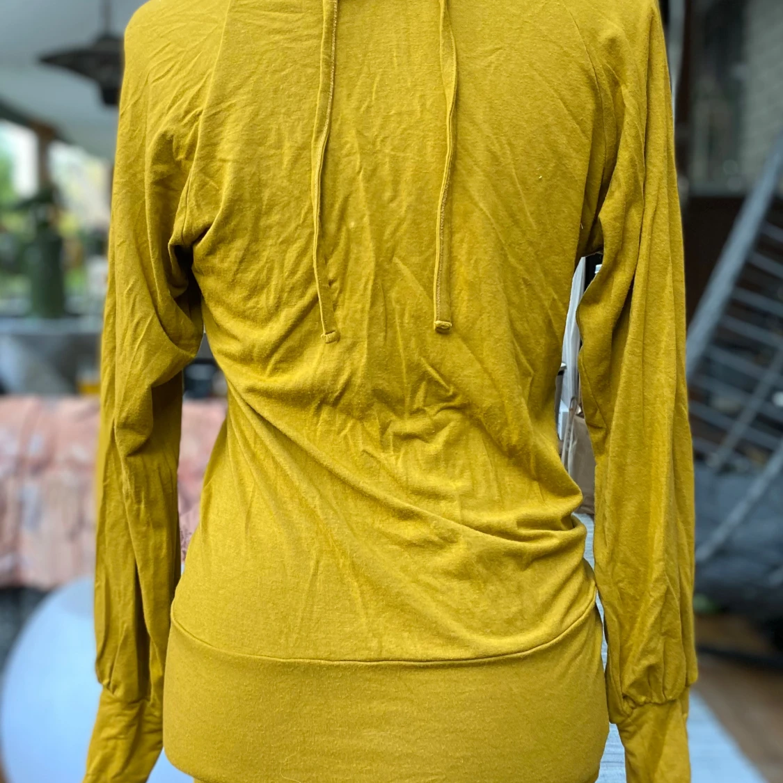 Senapsgul långärmad tröja med V-ringning och ett tryck framtill. Tröjan har en åtsittande passform och muddar vid ärmsluten. Den har även en detalj med dragsko baktill. Storlek: 1 Bomull Längd: 70 cm Bystmått: 49 cm Inga bilder när den sitter på mig! Katter finns i hemmet!