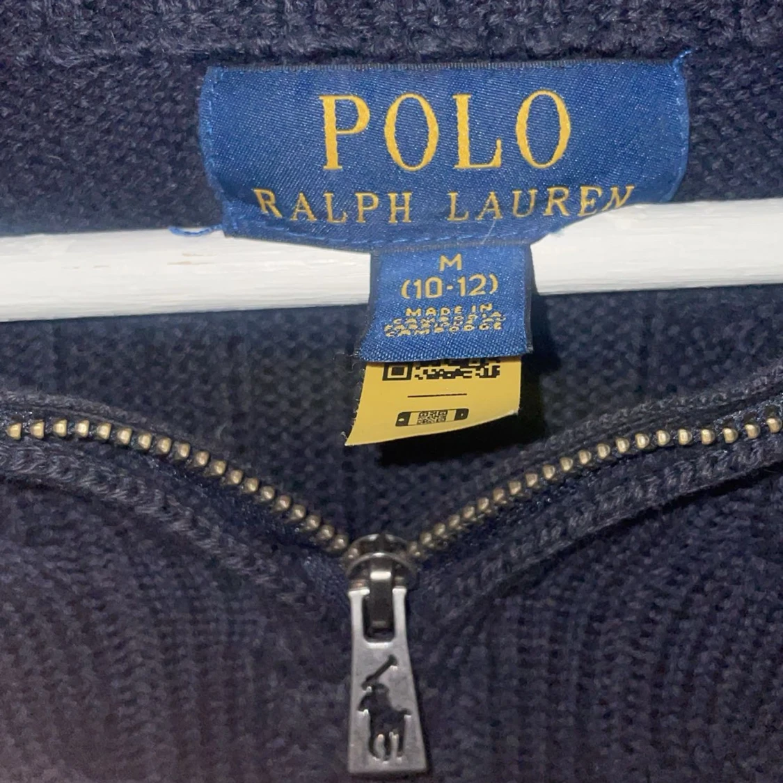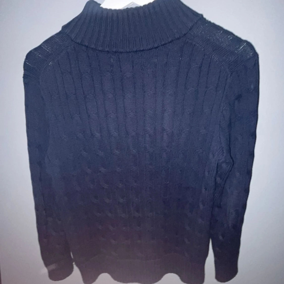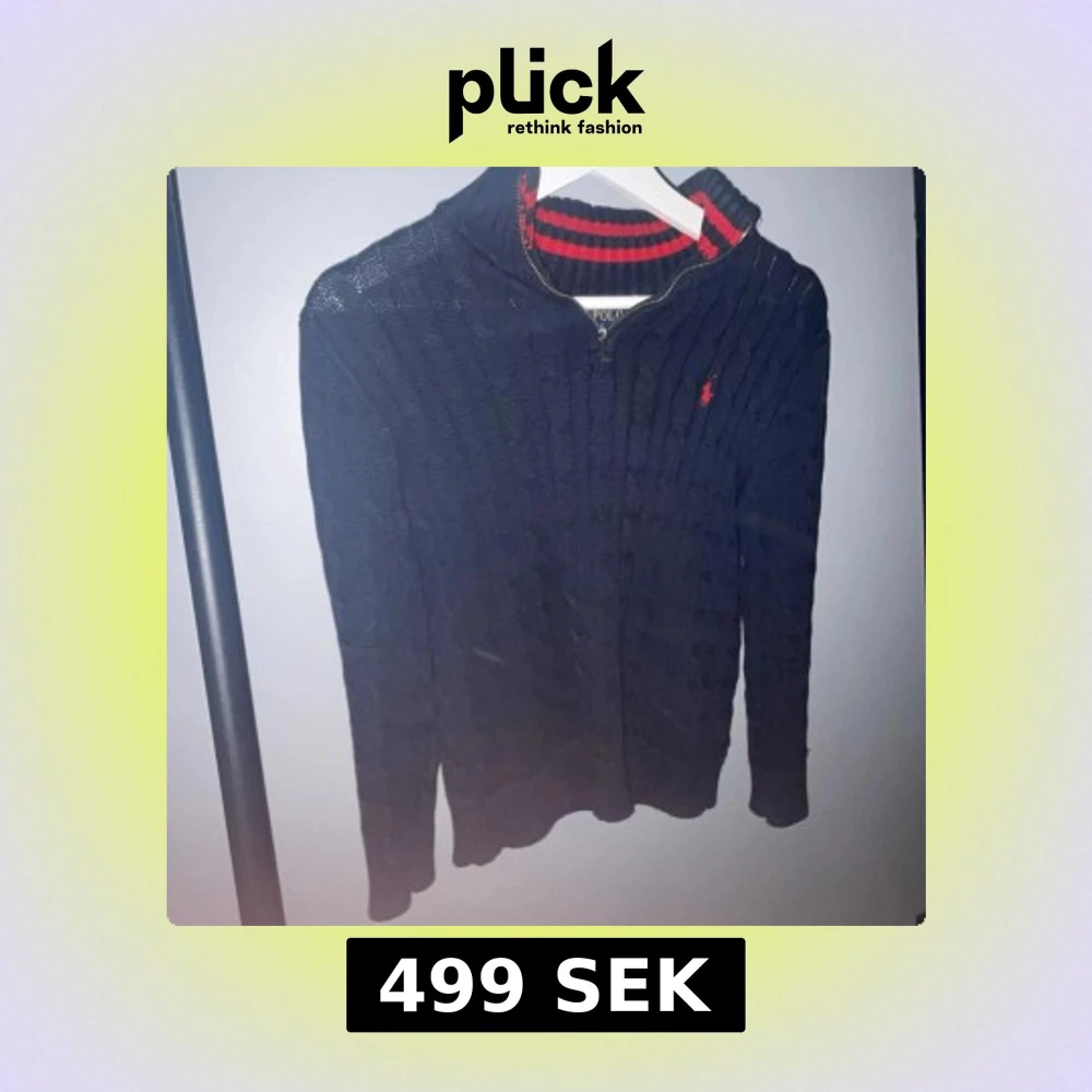 Säljer en snygg mörkblå stickad tröja från Ralph Lauren med dragkedja och röd logga på bröstet. Tröjan har en ribbad struktur och hög krage med röda ränder på insidan. Perfekt för kyliga dagar! Om de är nått ni undrar så fråga. Skulle säga att den är bra skick ungefär 8/10. Storlek 10/12 ungefär 146/152