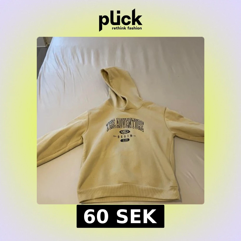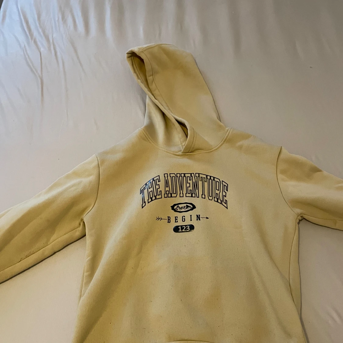 Beige hoodie med huva och trycket 'THE ADVENTURE BEGIN 123' på bröstet. Mjuk insida och ribbade muddar vid ärmslut och nederkant. Perfekt för chill dagar eller när du vill ha en avslappnad look.