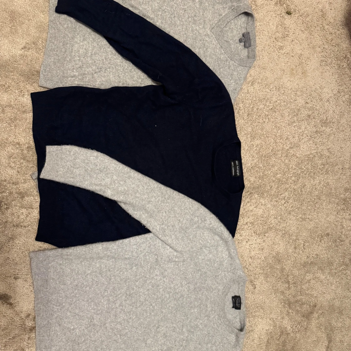 Säljer dessa gamla Kashmir tröjor från olika märken. Märkena är Zara, Marks & Spencer och Daniel Bishop. Den grå tröjan av Daniel Bishop har en V-neck. Storlekarna är lite annorlunda så det är bara att fråga om den du är intresserad av, men de ligger runt S/M herrstorlek. Storleken skriven på annonsen är för den blå tröjan. Det kan förekomma några hål samt ihopskydda hål så om du vill se dem kan jag skicka bilder privat. Priset på dessa är inte spikat så det är bara att lägga nya prisförslag.