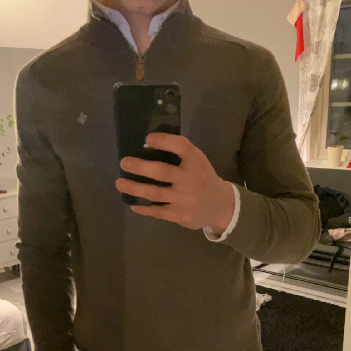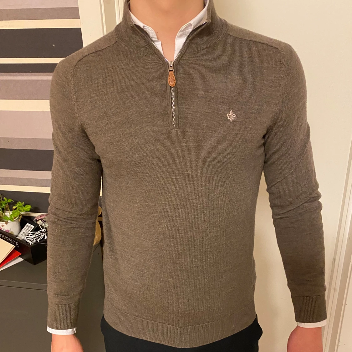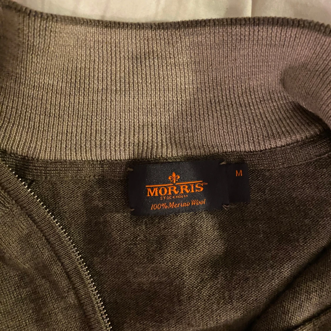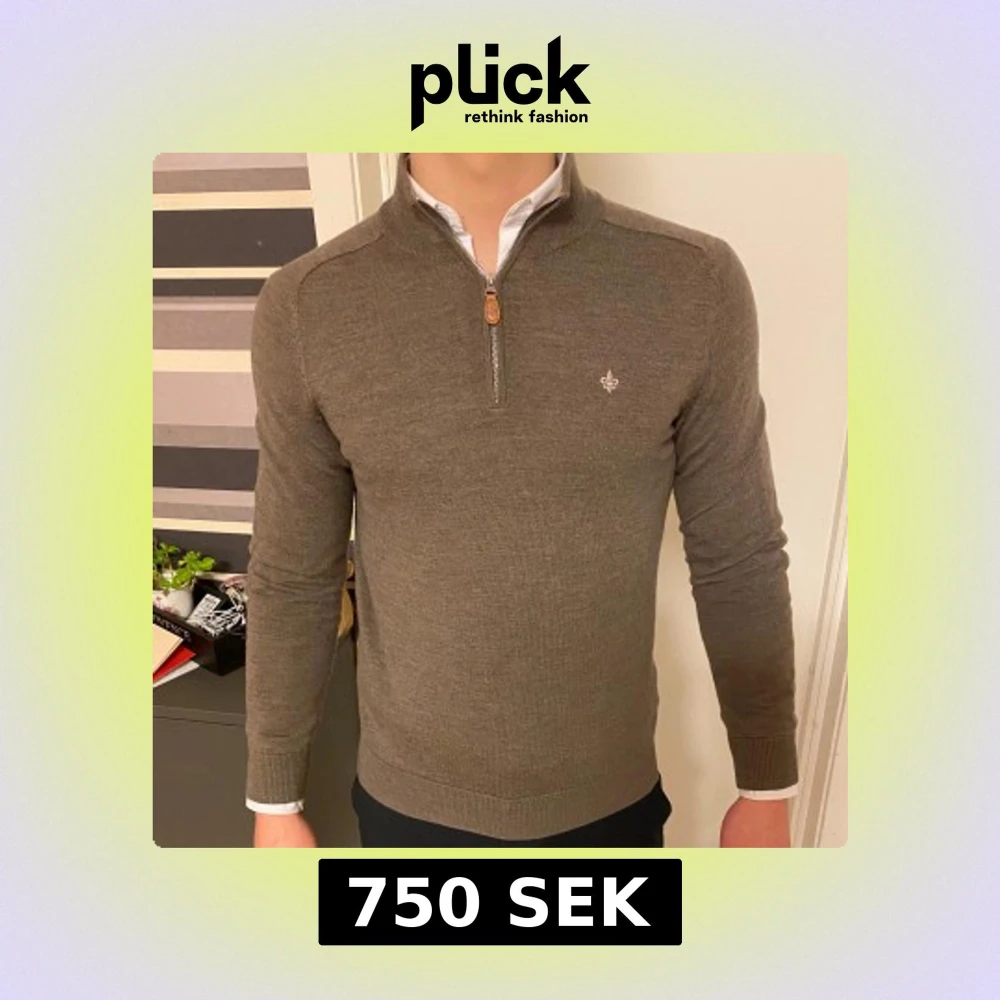 Säljer en stilren brun tröja från Morris i 100% merinoull. Tröjan har en dragkedja vid halsen och ett diskret emblem på bröstet. Perfekt för kyligare dagar.