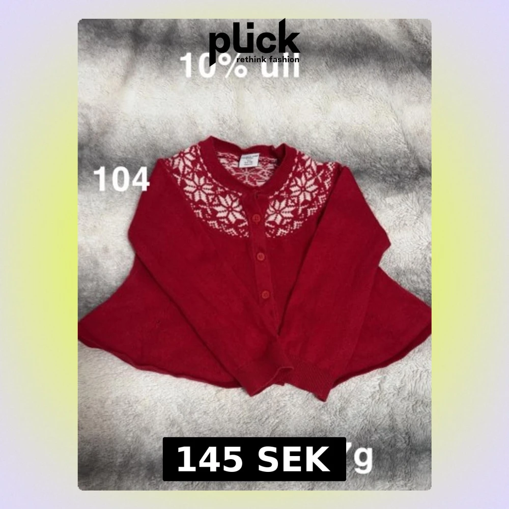 Mysig röd kofta från Polarn O. Pyret med vita snöflingor runt halsen. Tröjan har långa ärmar, rund halsringning och knäppning framtill med matchande röda knappar. Innehåller 10% ull för extra värme.🌸 Fint använt skick.. Storlek 104