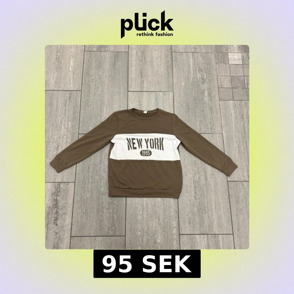 Brun långärmad tröja från Shein med vit panel över bröstet och trycket 'NEW YORK 1995'. Tröjan har rund halsringning och normal passform. Perfekt för dig som gillar streetstyle och enkel design.