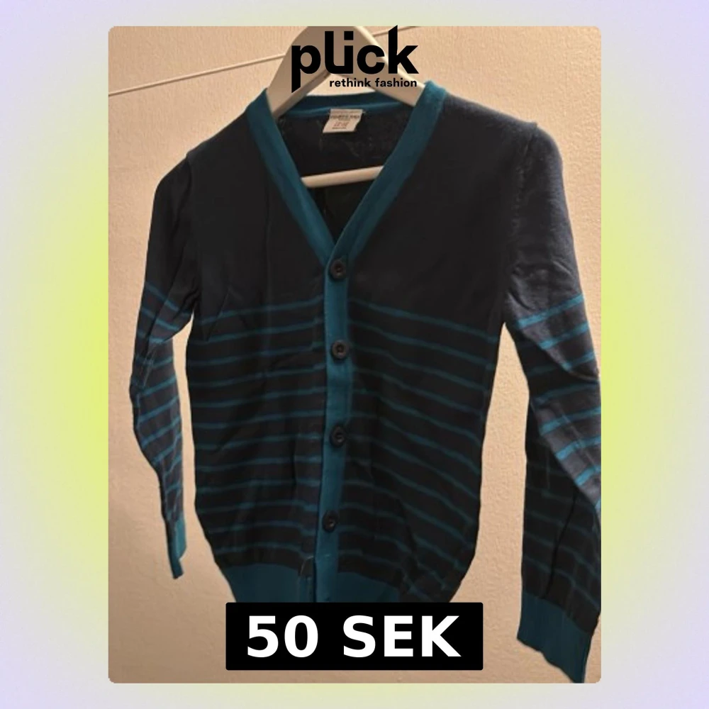 Snygg randig kofta i mörkblått och turkost från Polarn o Pyret. Koftan har långa ärmar, v-ringning och knäppning framtill med fyra knappar.