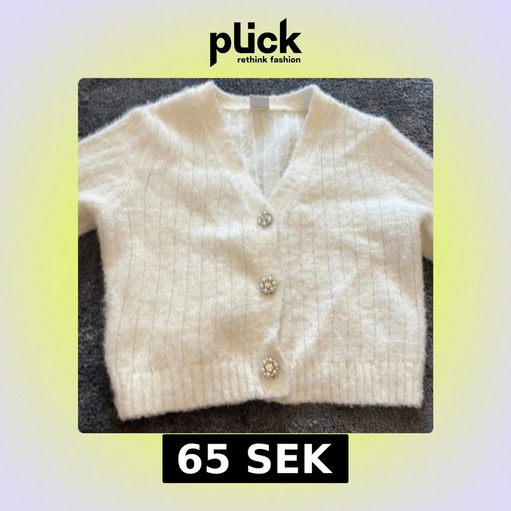 Mysig vit kofta med ribbad struktur och dekorativa pärlknappar framtill. Perfekt för kyliga dagar med sin mjuka och fluffiga känsla. Koftan har långa ärmar och en v-ringad design som ger en stilren look.