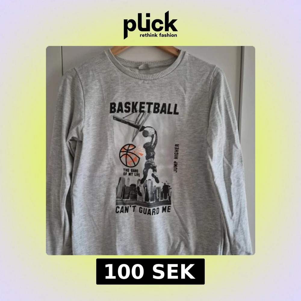 Säljer en grå sweatshirt med ett coolt baskettryck på framsidan. Tröjan har långa ärmar och en rund halsringning. Perfekt för sportiga tillfällen eller avslappnade dagar. 🏀