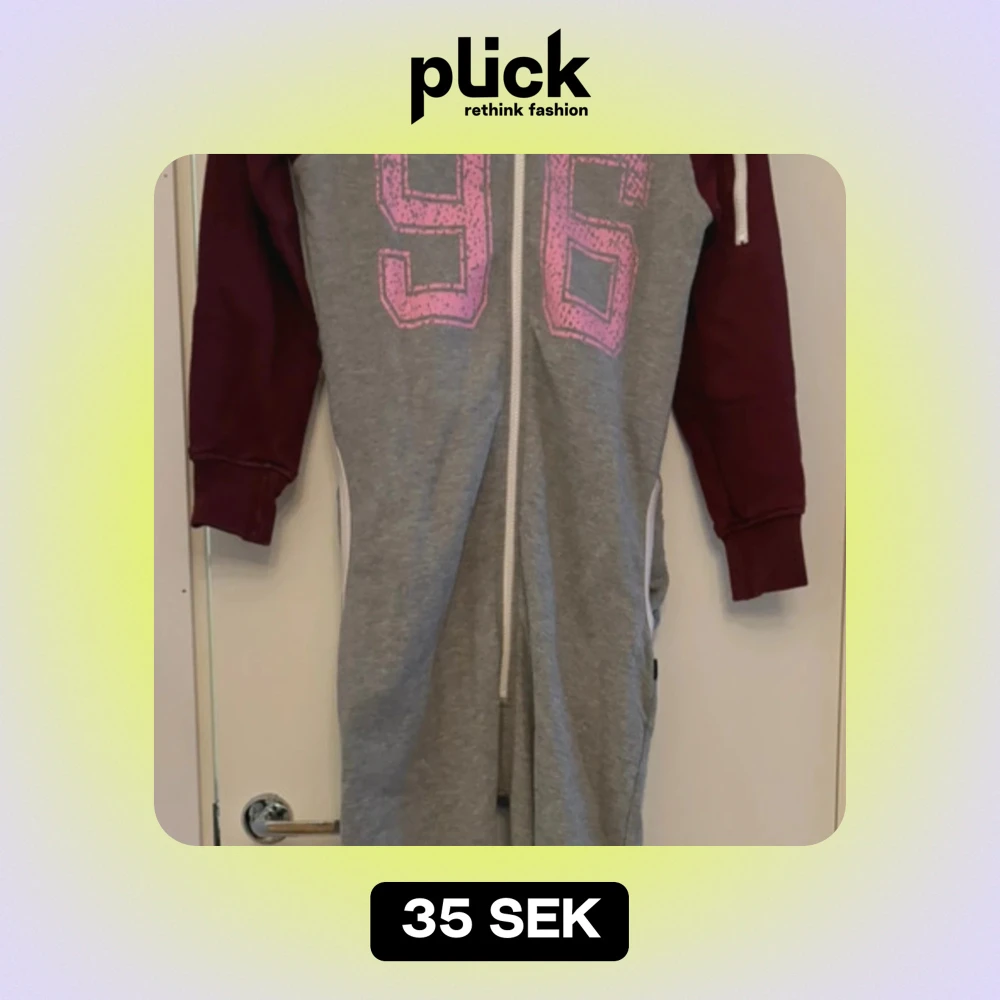 Supermysig onesie i grått med vinröda ärmar och huva. Den har en stor rosa '96' på framsidan och en praktisk dragkedja som går att dra upp hela vägen. Perfekt för chilliga dagar hemma eller som en cool outfit för en avslappnad dag ute. Passar perfekt för höst och vinter!