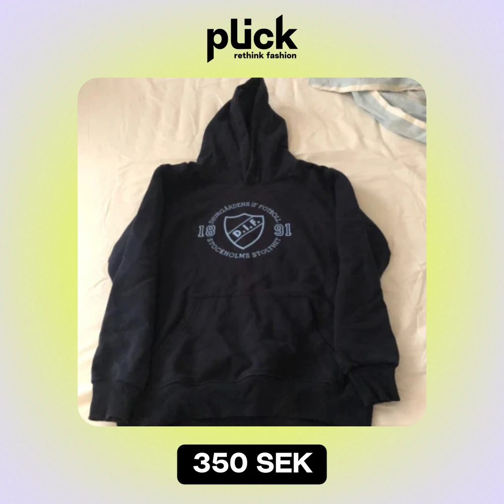 Säljer en svart hoodie med Djurgårdens IF Fotboll-logga på bröstet. Den har en stor ficka fram och en mysig huva. Perfekt för kalla dagar eller när du vill visa ditt stöd för laget!