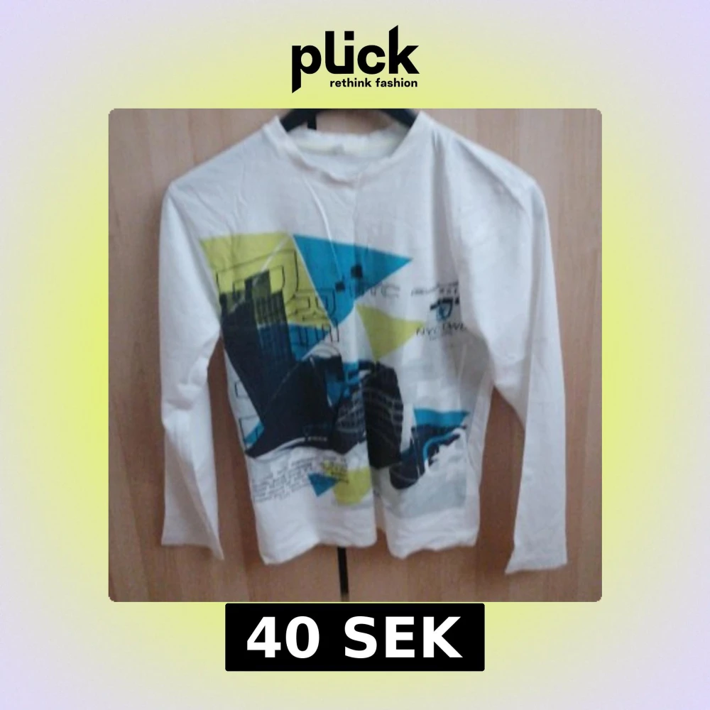Säljer en vit långärmad tröja med ett coolt grafiskt tryck i blått, gult och svart. Perfekt för en avslappnad stil med en unik touch. Tröjan har en rund hals och är tillverkad i ett mjukt material.