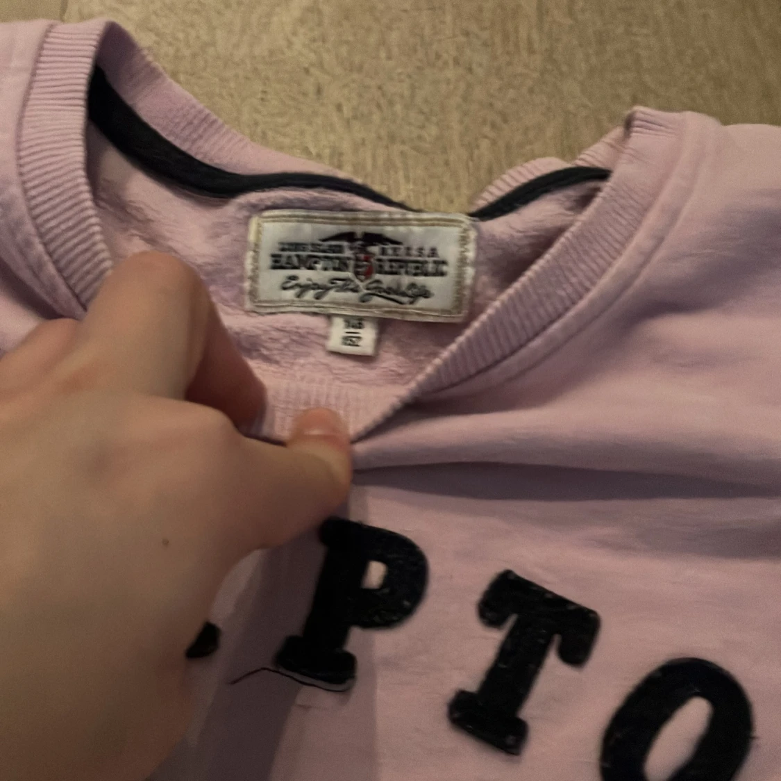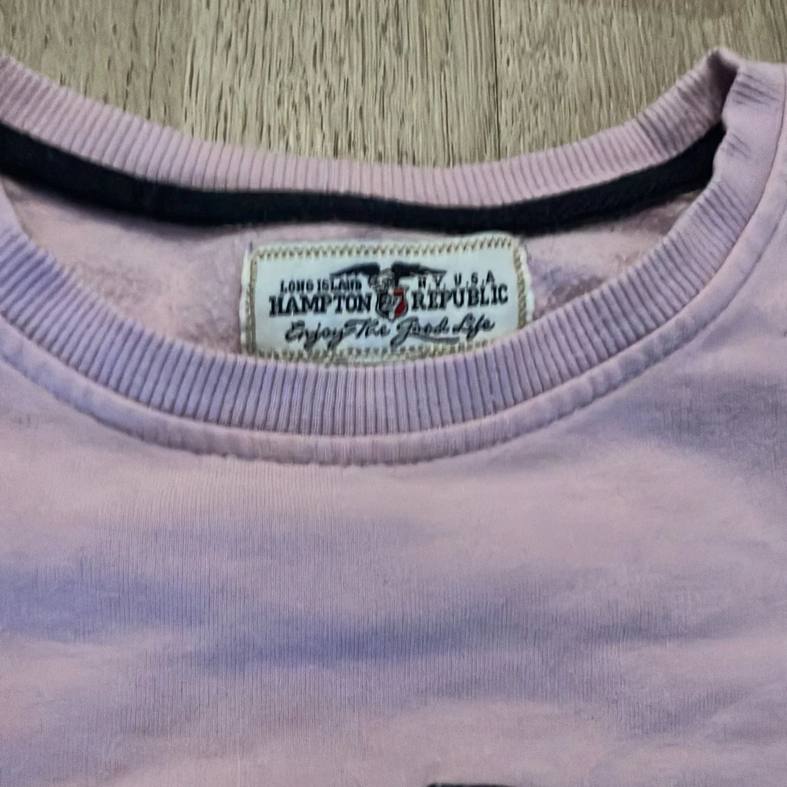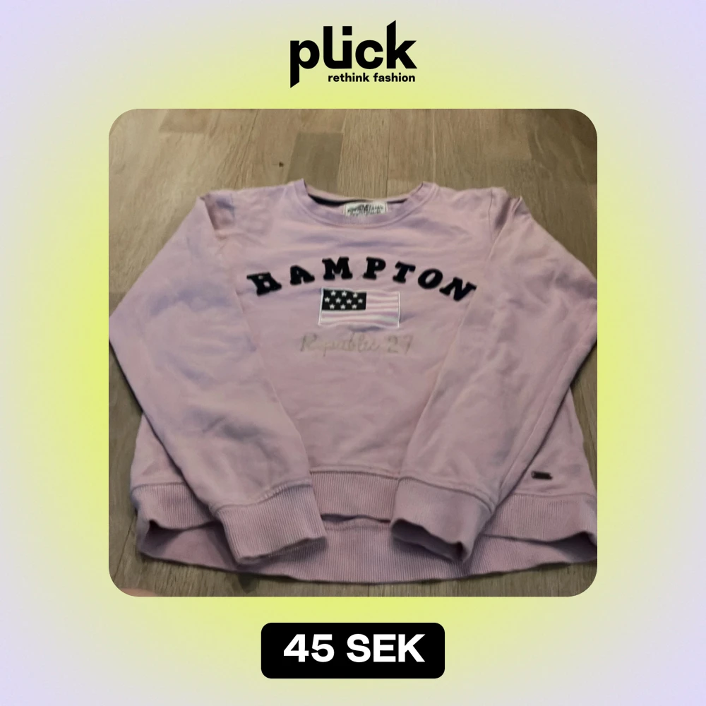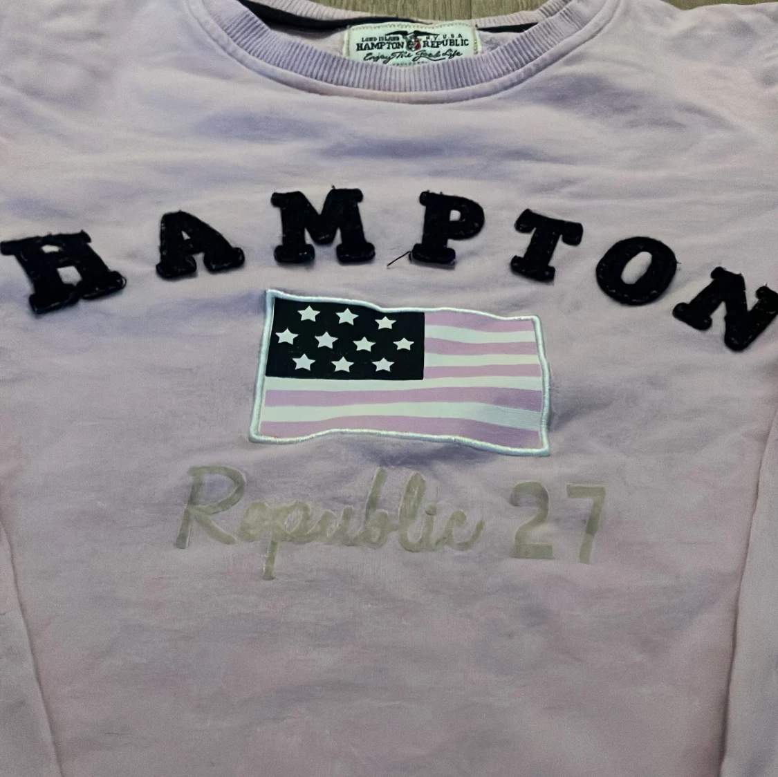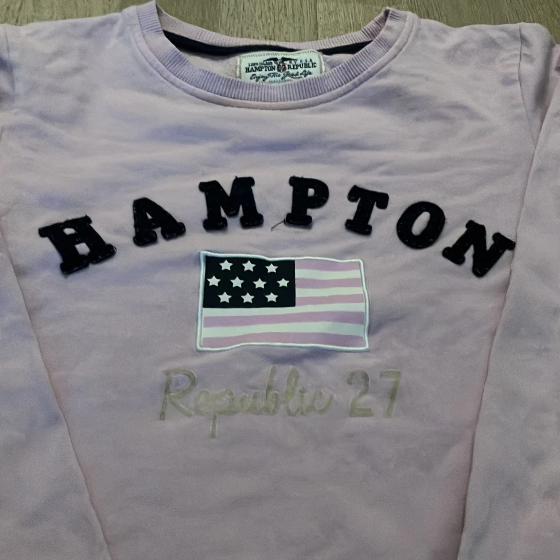 Säljer en ljuslila tröja från Hampton Republic med texten 'HAMPTON' och en flagga på framsidan. Tröjan har långa ärmar och är i bra skick. Perfekt för en avslappnad stil!