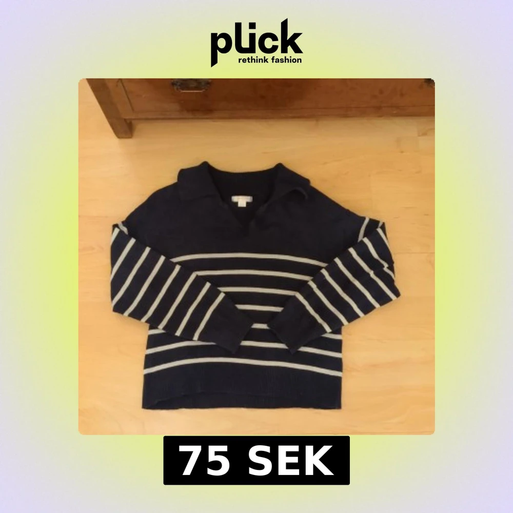 Säljer en snygg mörkblå tröja med vita ränder. Tröjan har en krage och långa ärmar, perfekt för en stilren look. Den är tillverkad i ett mjukt material som känns skönt mot huden.