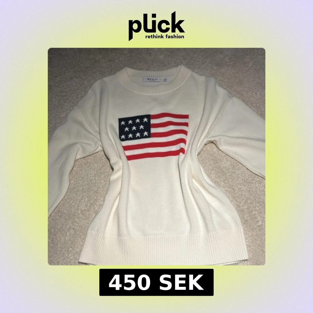 Vit stickad tröja från RYVLS med amerikansk flagga på bröstet. Tröjan har rund halsringning, ribbade muddar och är tillverkad i en mjuk blandning av bomull och akryl. Perfekt för dig som gillar klassisk och stilren design med en twist.