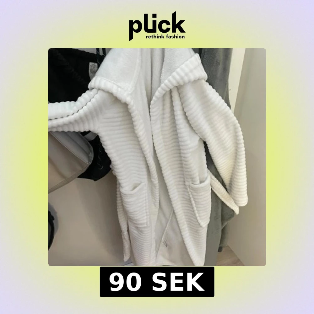 Supermysig vit morgonrock med ribbad struktur, stora fickor framtill och ett matchande bälte i midjan. Morognrocken har en bred krage och är långärmad, perfekt för att hålla sig varm och chill morgon.