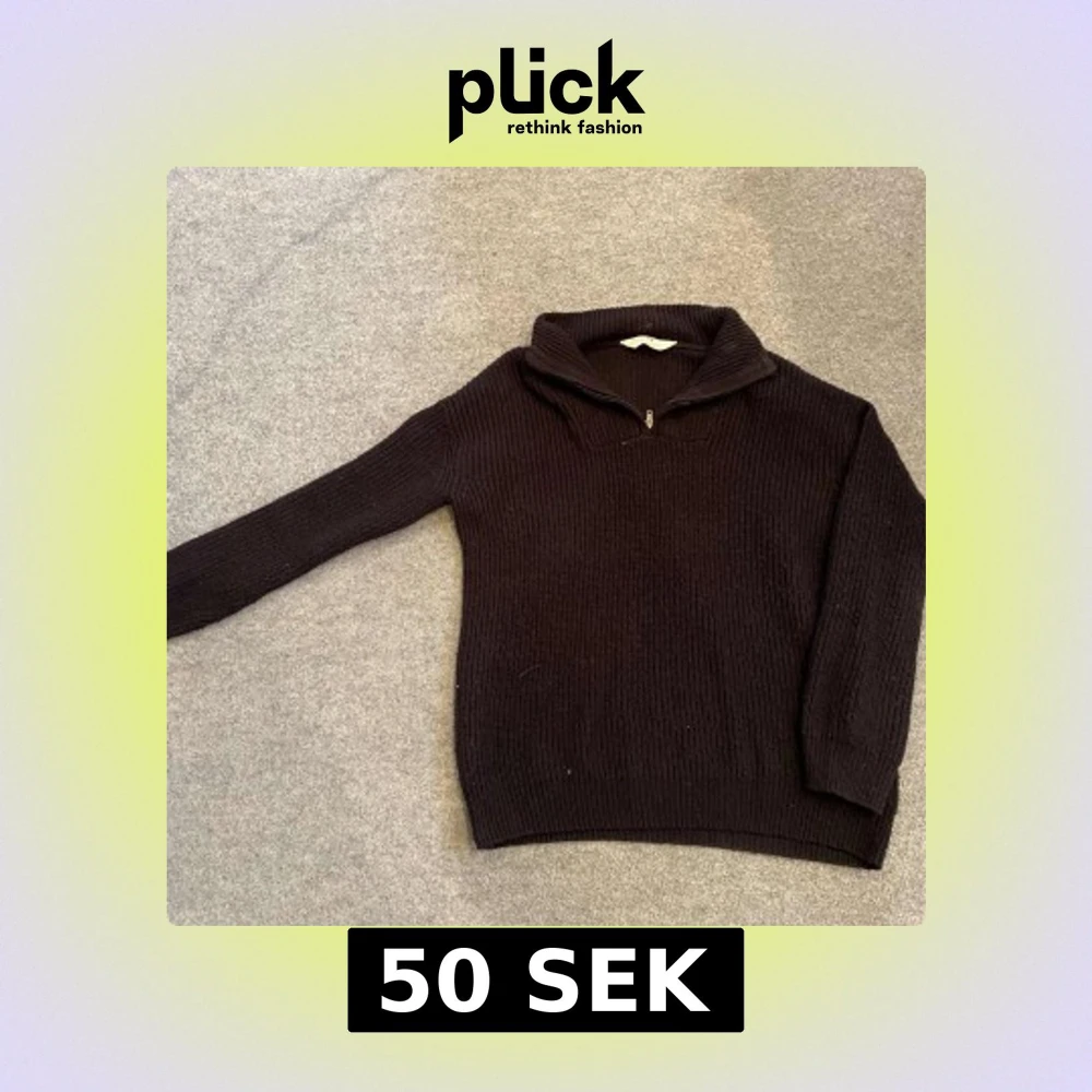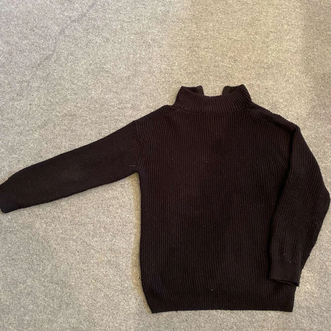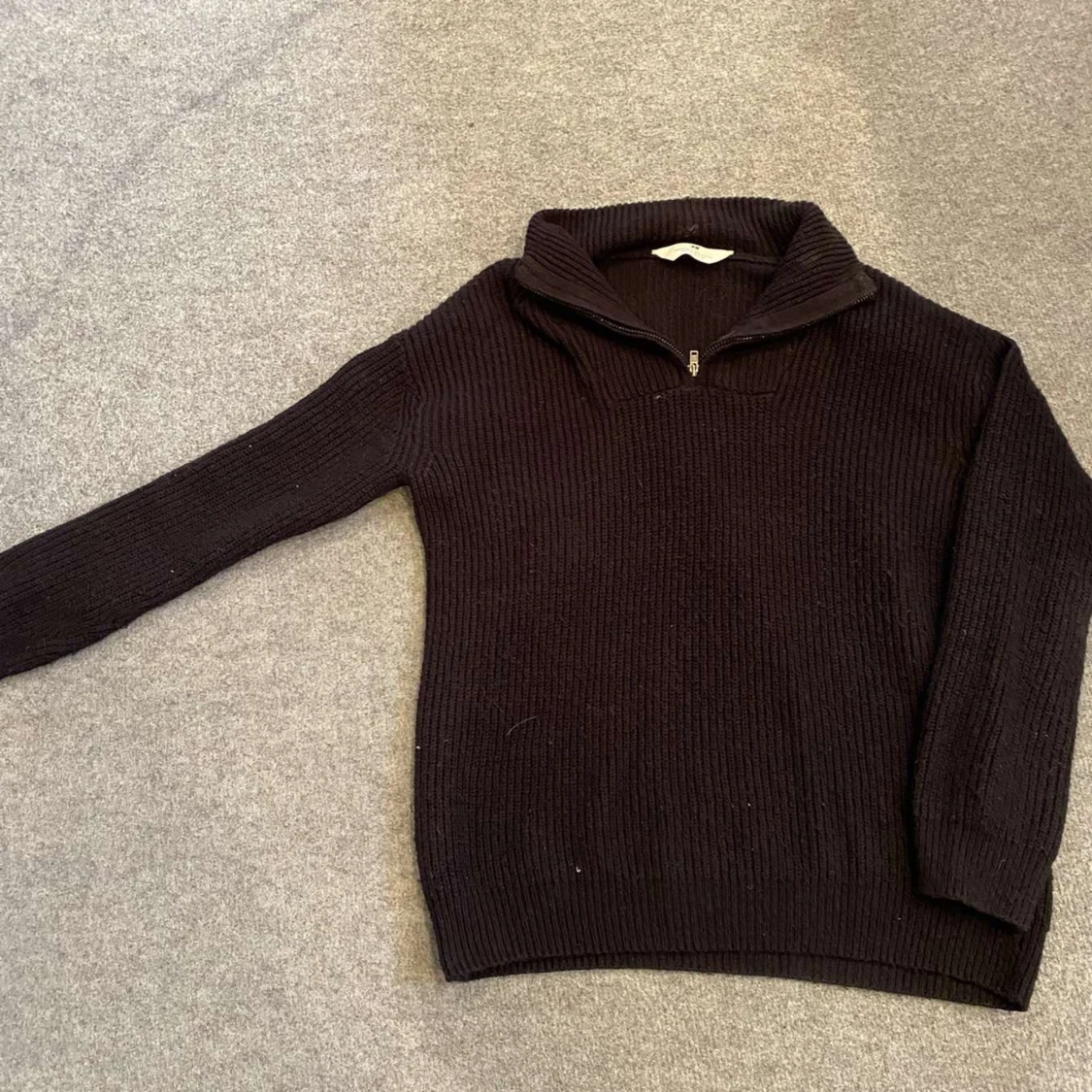 Säljer en stilren svart stickad tröja med dragkedja vid halsen. Tröjan har långa ärmar och en ribbad struktur som ger en klassisk look. Perfekt för kyligare dagar.