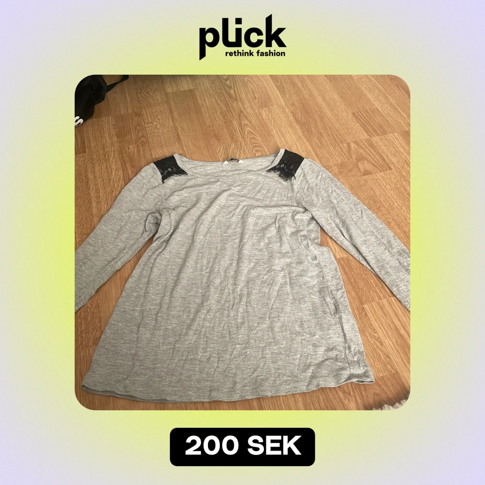 Säljer en snygg grå långärmad tröja med svarta spetsdetaljer vid axlarna. Perfekt för både vardag och lite finare tillfällen. Tröjan är i bra skick och passar åldern 11-12 år. Supermjuk och bekväm att ha på sig!