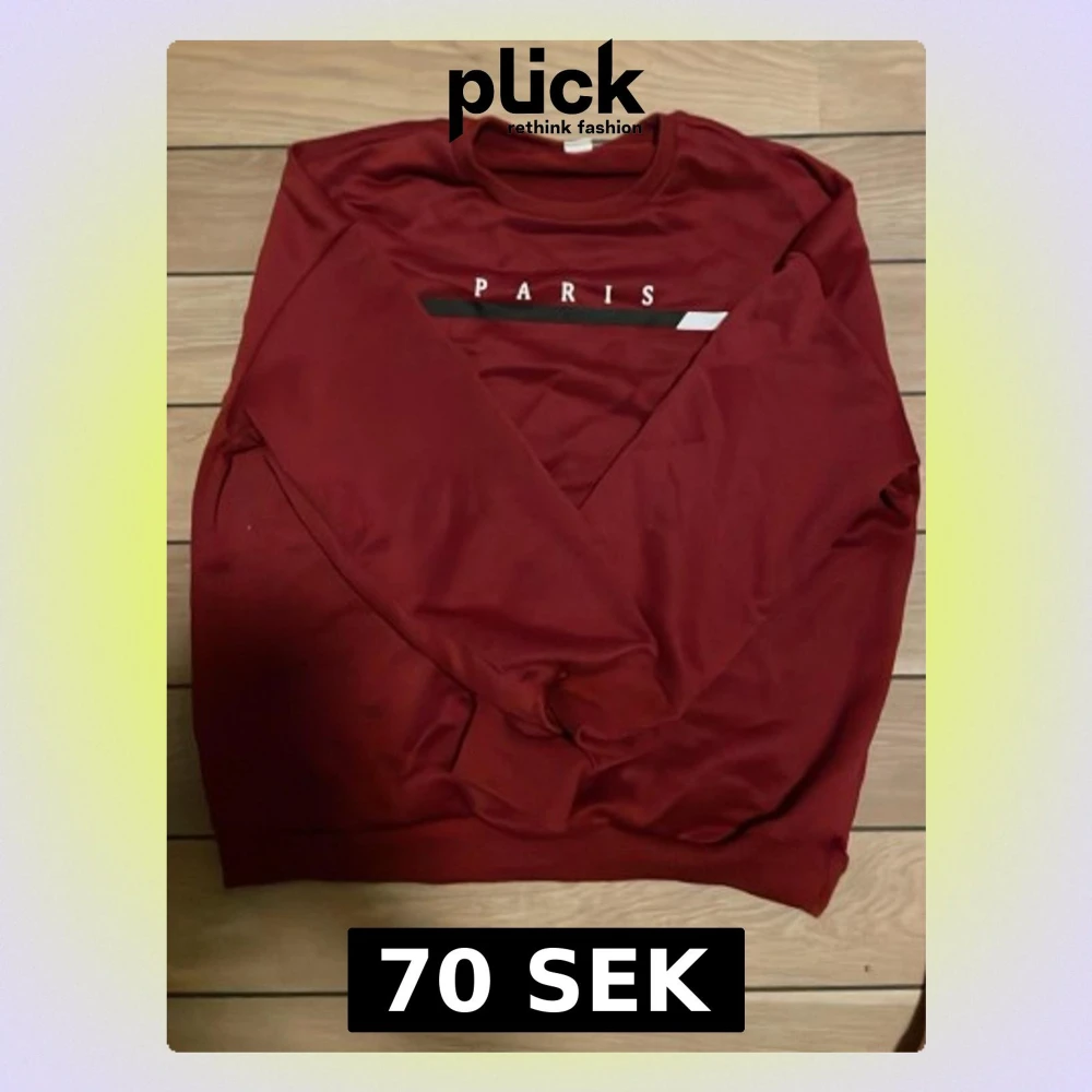 Säljer en vinröd sweatshirt med trycket 'PARIS' över bröstet och en svart samt vit linje. Tröjan har rund hals och långa ärmar, perfekt för dig som gillar enkel och stilren design. Materialet känns mjukt och är troligtvis polyester. Den passar från 140-156