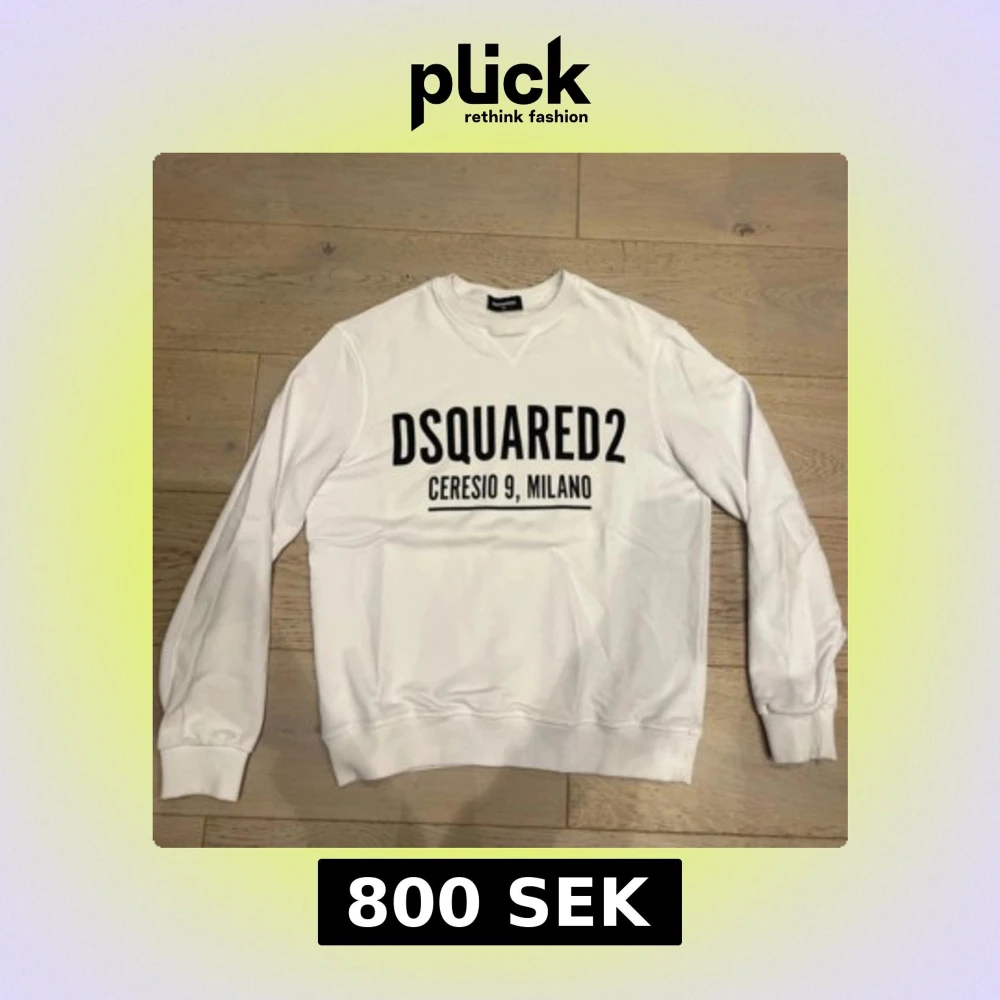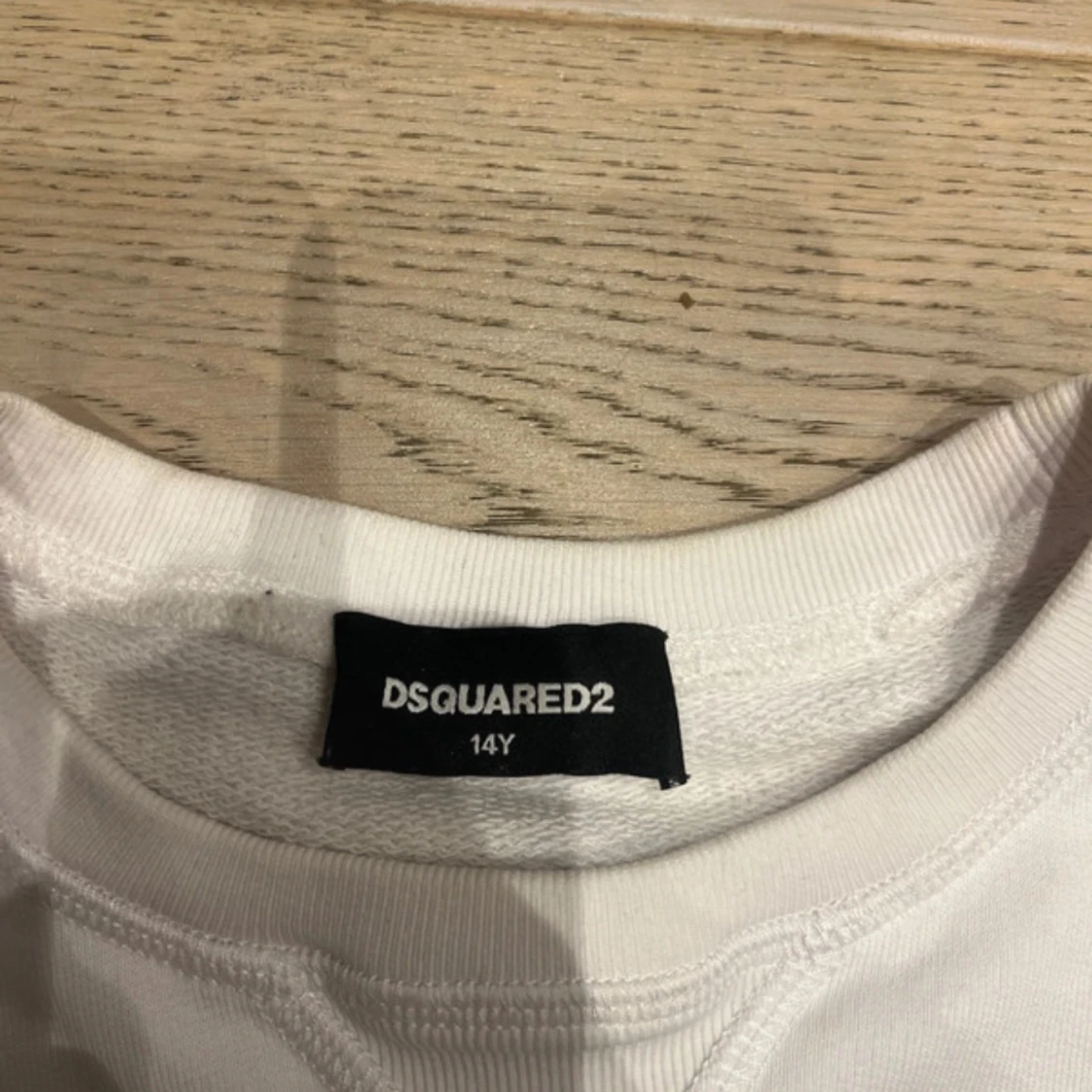 Säljer en vit sweatshirt från Dsquared2 med svart tryck framtill där det står 'DSQUARED2 CERESIO 9, MILANO'. Tröjan har rund halsringning, långa ärmar och ribbade muddar. Perfekt för dig som gillar stilrena och trendiga plagg.