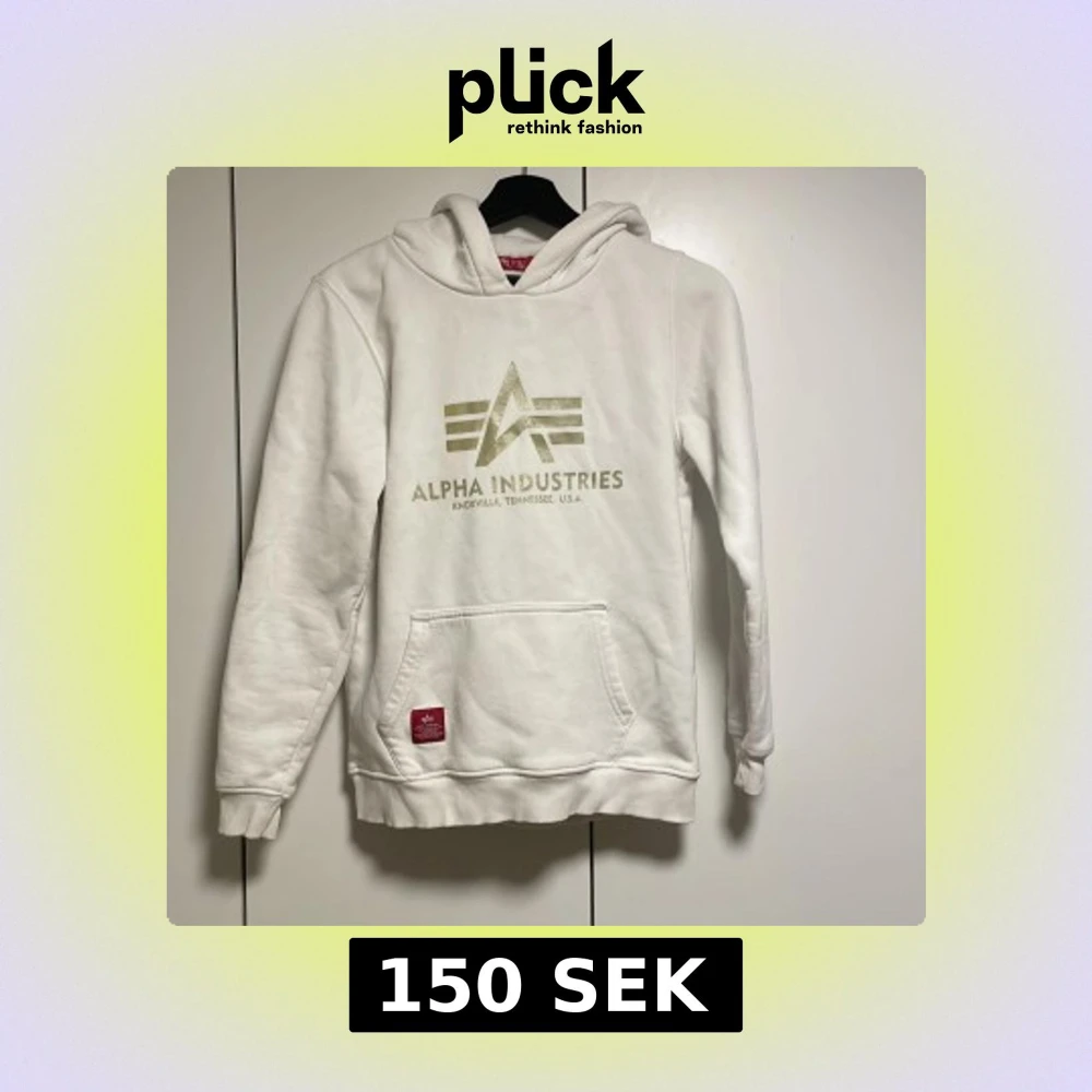 Säljer en vit hoodie från Alpha Industries med guldigt tryck framtill och klassisk känguruficka. Tröjan har huva och ribbade muddar vid ärmslut och nederkant. Perfekt för en avslappnad stil.
