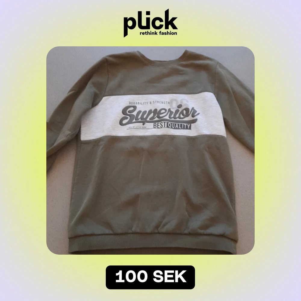 Säljer en snygg grön sweatshirt med grått tryck på bröstet där det står 'Superior Best Quality'. Tröjan har långa ärmar och är perfekt för en avslappnad stil. Den är i bra skick och passar perfekt till vardags.