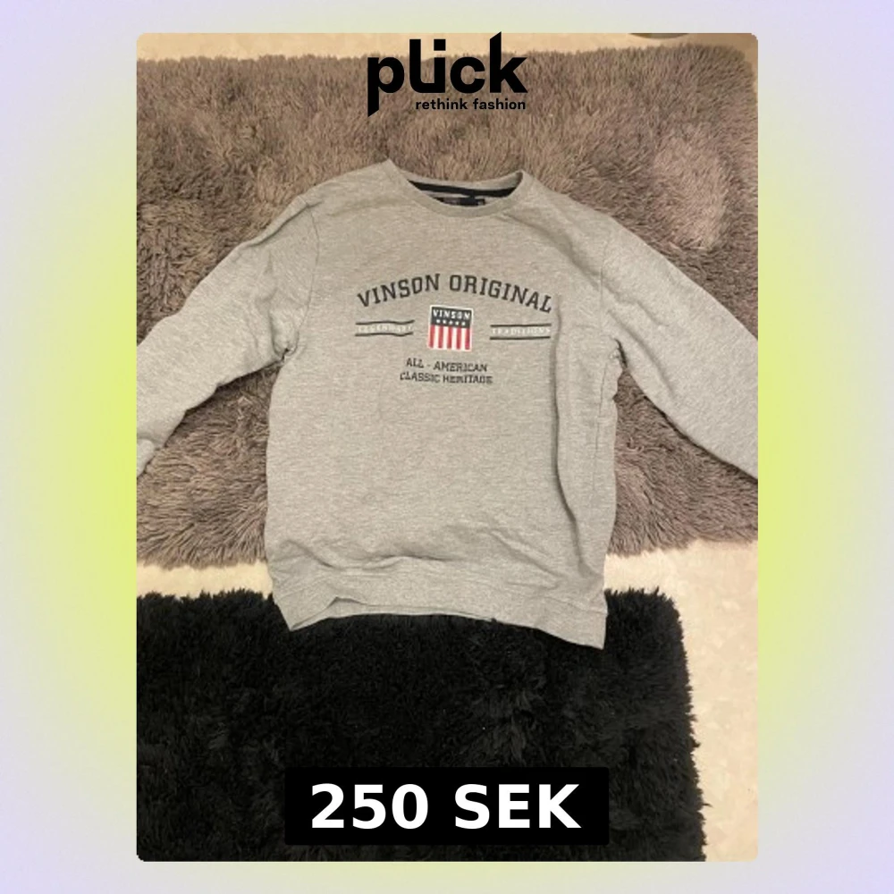 Säljer en grå sweatshirt från Vinson Original med tryck framtill i svart, vitt och rött. Tröjan har rund halsringning och långa ärmar. Skön och enkel stil med klassisk amerikansk vibe, perfekt till jeans eller joggers. Priset kan sänkas vid diskussion