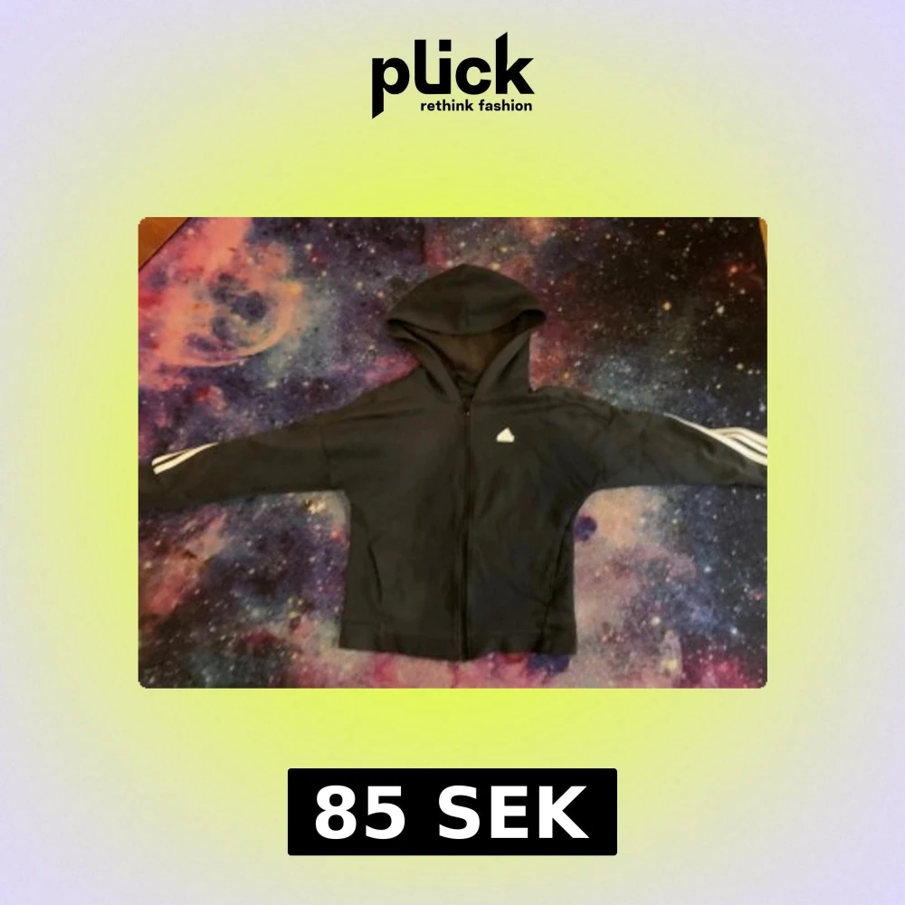Svart hoodie från Adidas med dragkedja framtill och huva. Tröjan har långa ärmar med tre vita ränder längs sidorna och en liten vit logga på bröstet. Tillverkad i mjuk bomull och polyester, perfekt för chill eller träning.