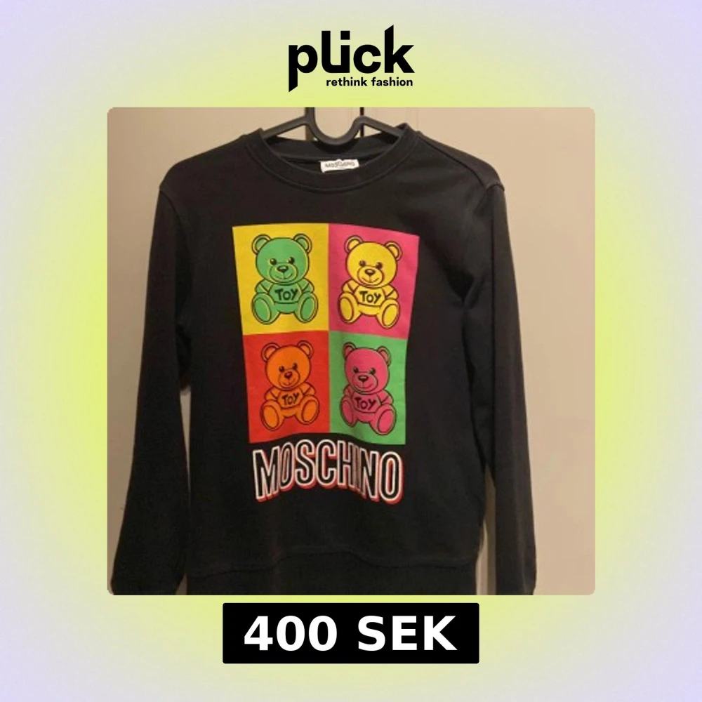 Svart långärmad tröja från Moschino med färgglatt pop art-tryck av fyra nallar i grönt, gult, orange och rosa. Stor MOSCHINO-logga framtill. Mjuk bomullskänsla och relaxed fit, perfekt för dig som gillar statement-plagg.