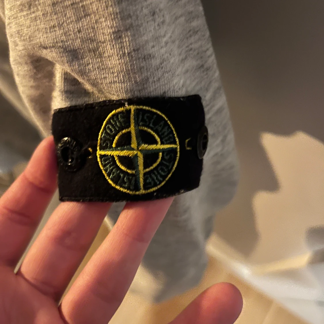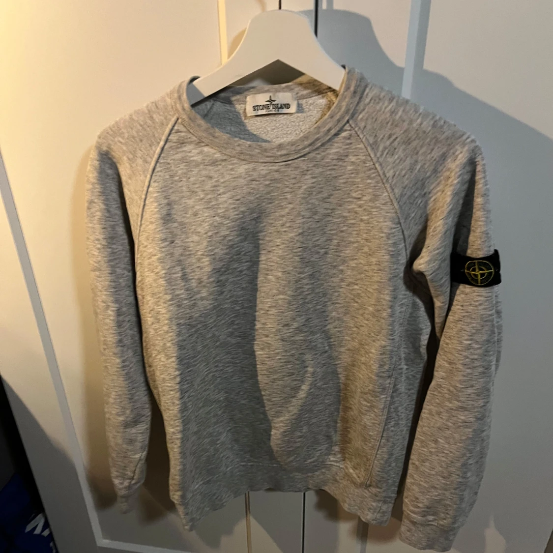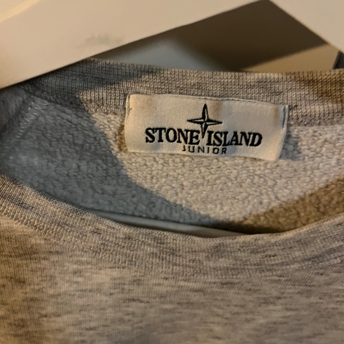 Säljer en stilren grå sweatshirt från Stone Island Junior. Tröjan har långa ärmar och en klassisk rund halsringning. Den är prydd med det ikoniska Stone Island-märket på ärmen. Perfekt för en avslappnad och trendig look. Storlek 12 år/ 156
