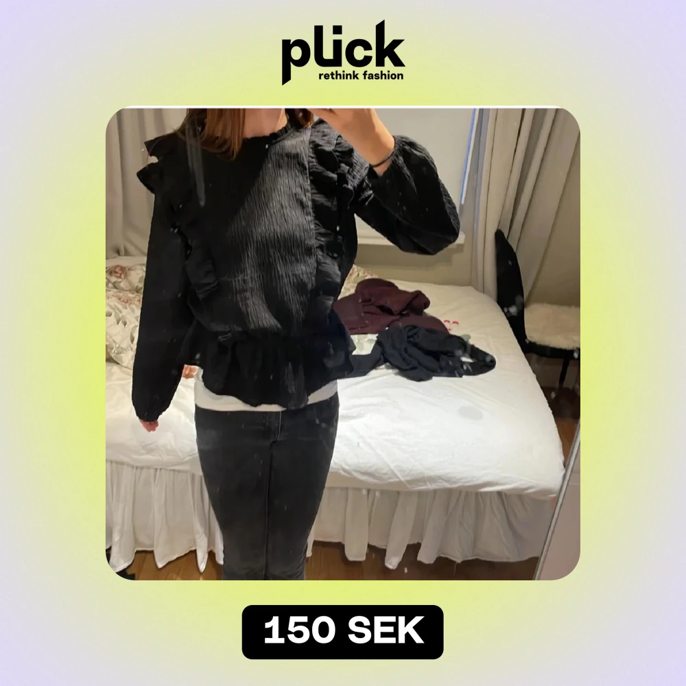 Säljer en snygg svart blus med volanger. Perfekt för både vardag och fest! Den har långa ärmar och en loose passform som gör den superbekväm. Passar perfekt till jeans eller kjol för en chic look. 🖤