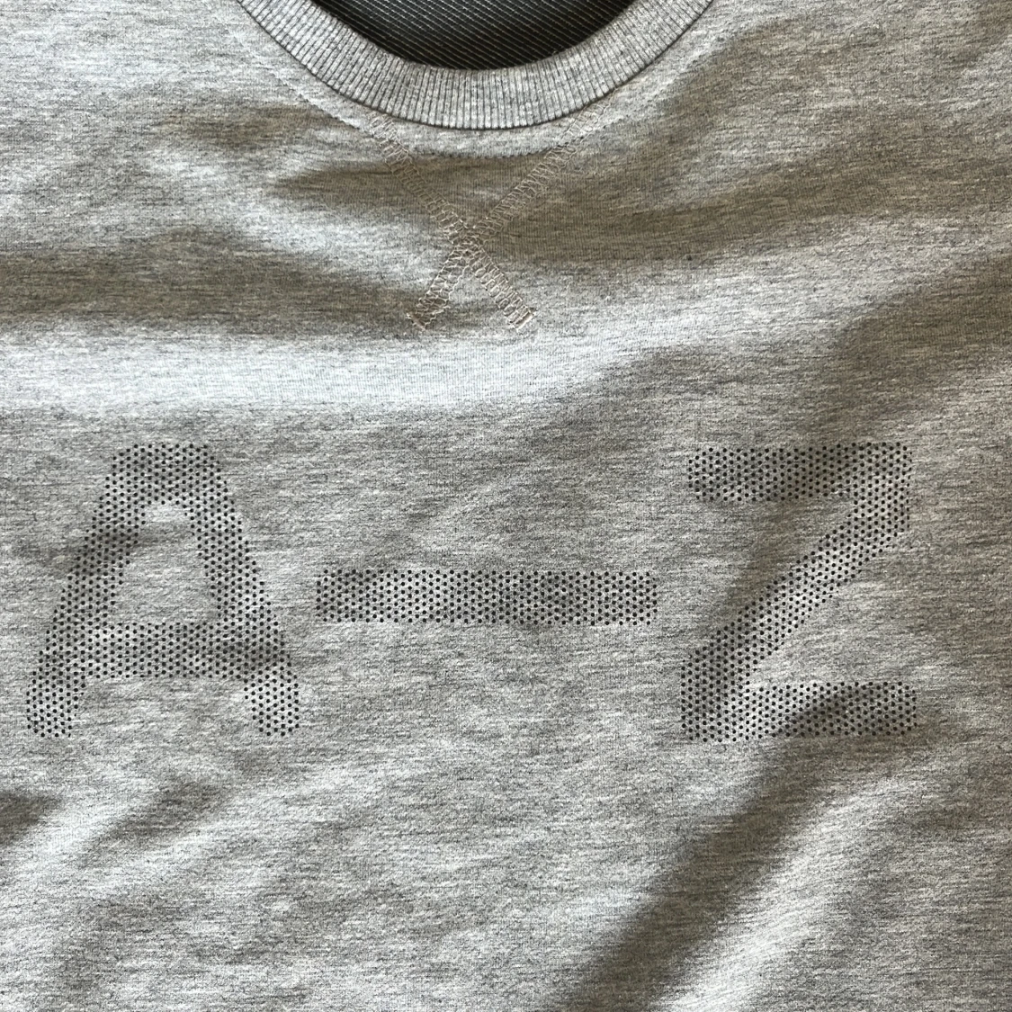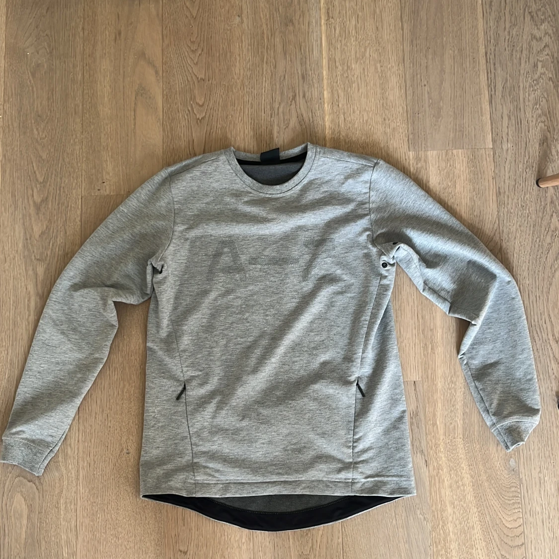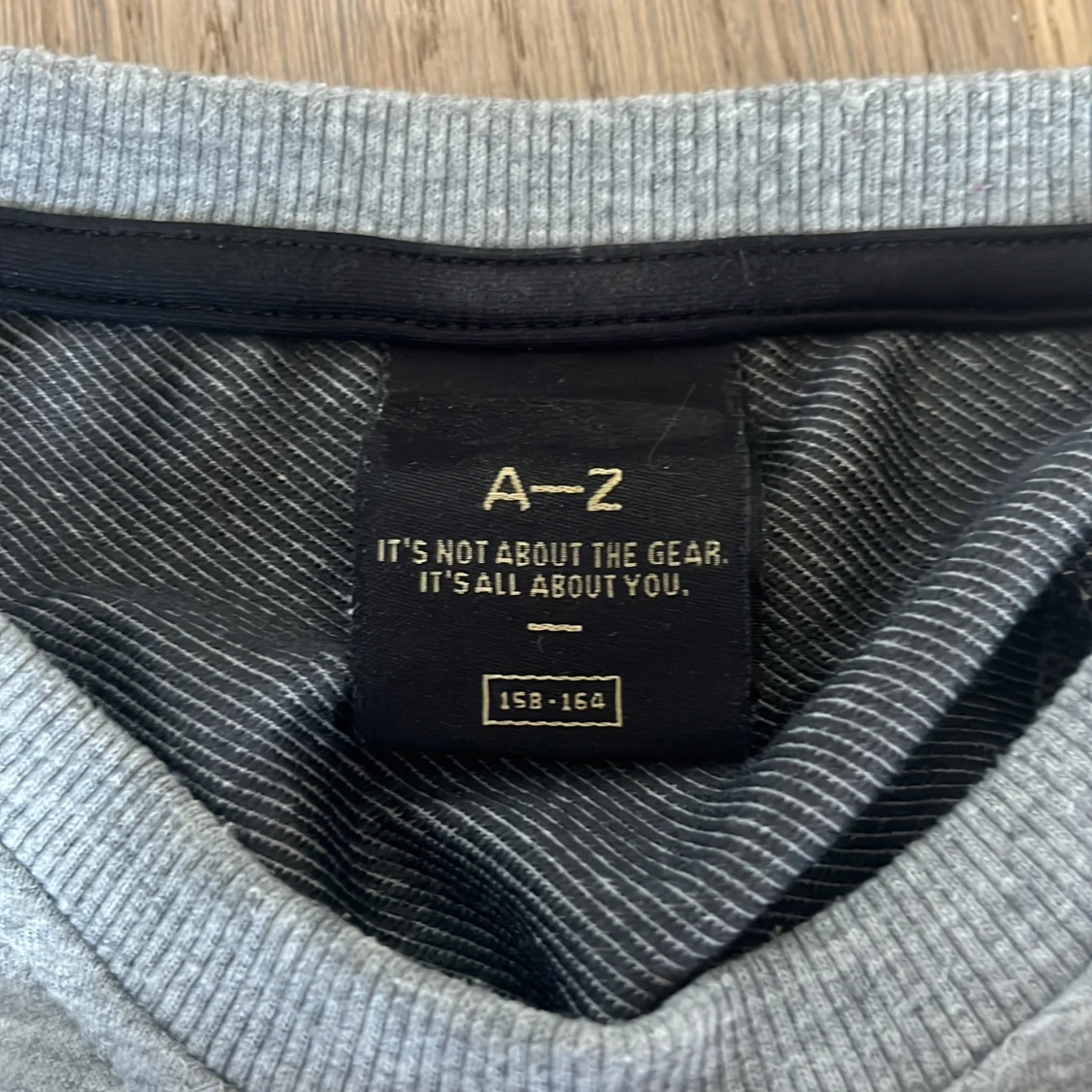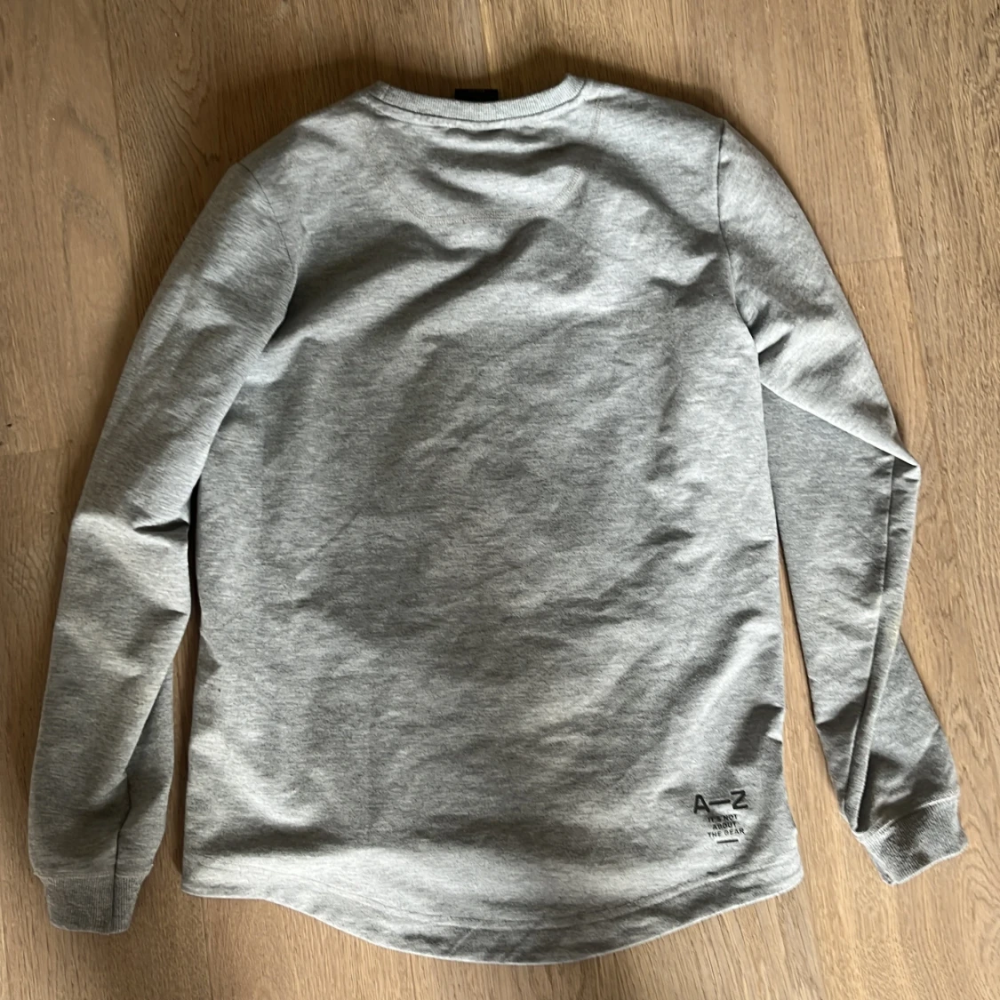 Säljer en stilren grå tröja från A-Z med diskret tryck på framsidan. Tröjan har långa ärmar och en rund halsringning. Även två diskreta fickor på framsidan.Perfekt för en avslappnad stil.
