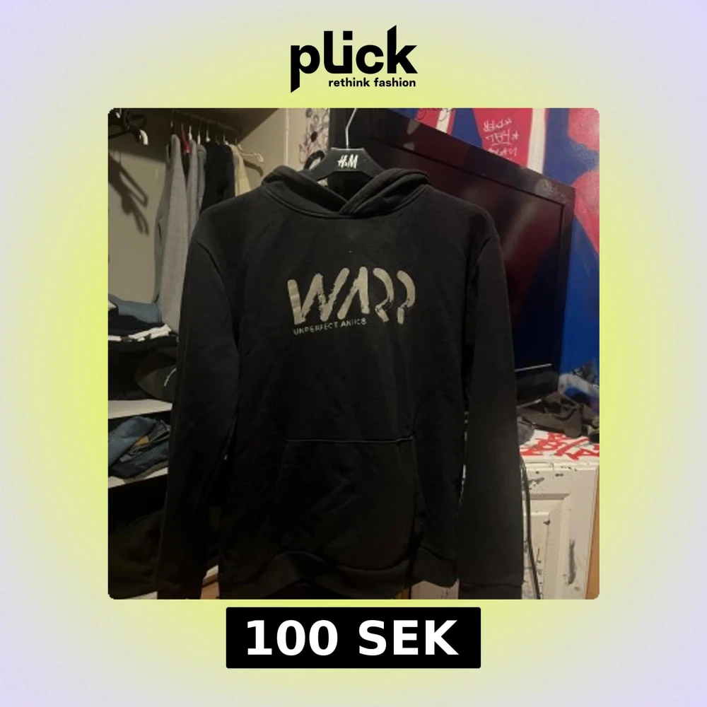 Svart hoodie från WARP med stort tryck på bröstet och texten 'UNPERFECT ANICS'. Tröjan har huva och en klassisk magficka. Perfekt för chill dagar och streetwear-stil. Materialet känns mjukt och bekvämt, troligen bomull eller polyester. Passar dig som gillar enkel och cool design.
