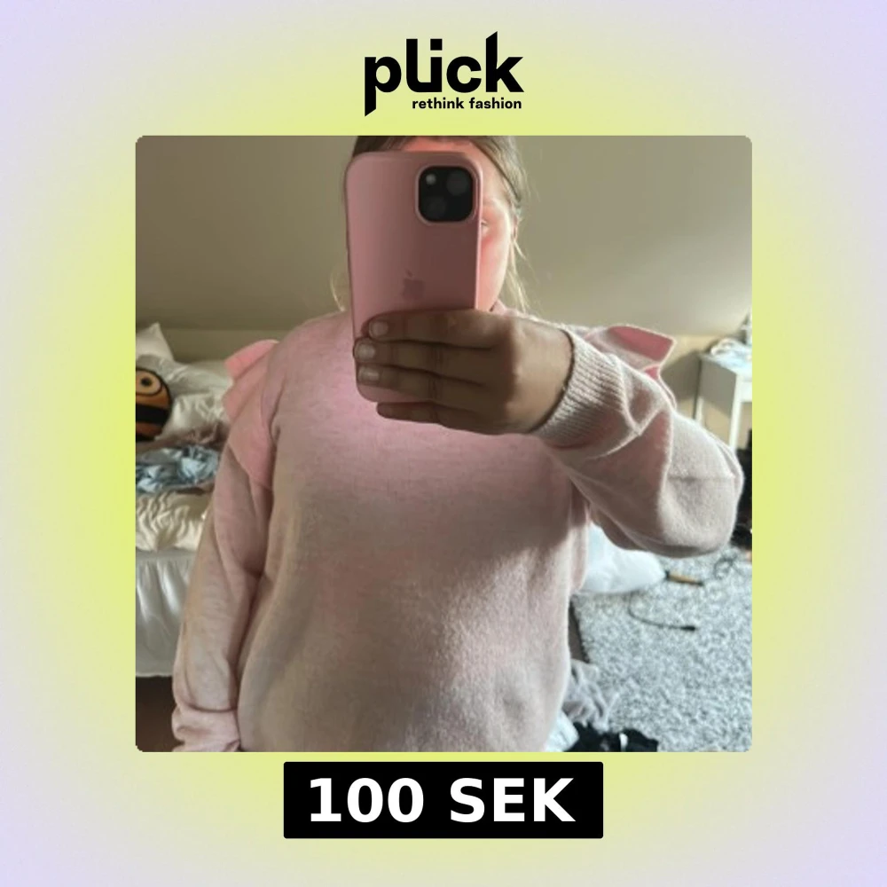 Säljer en ljusrosa stickad tröja med volangdetaljer på axlarna. Tröjan har lång ärm och är mjuk och bekväm, perfekt för dig som gillar en söt och trendig stil.
