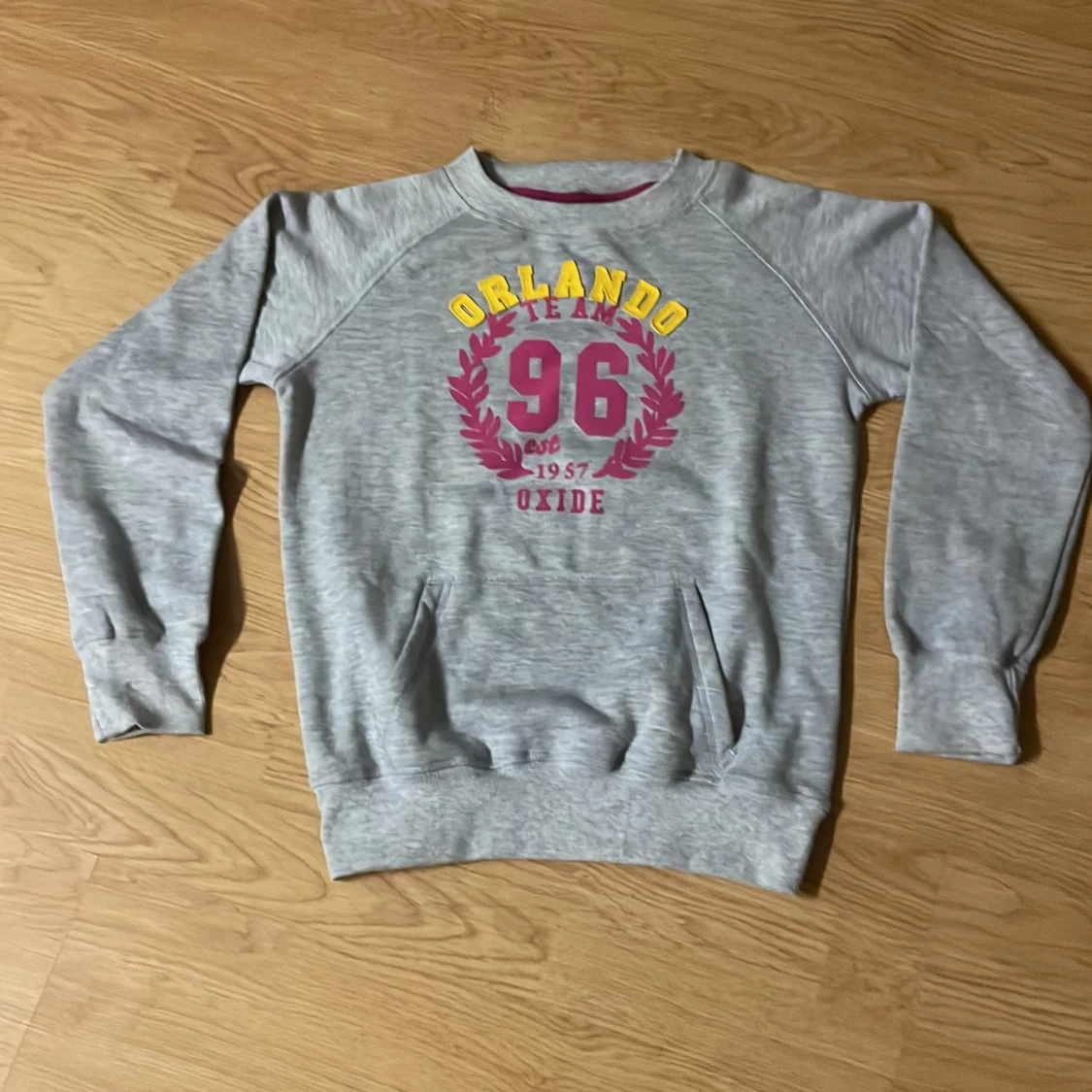 Grå sweatshirt från Oxide med tryck i gult och rött framtill där det står 'Orlando Team 96'. Tröjan har rund hals, långa ärmar och en magficka. Mjuk insida och ribbade muddar vid ärmslut och nederkant. Perfekt för chill dagar.