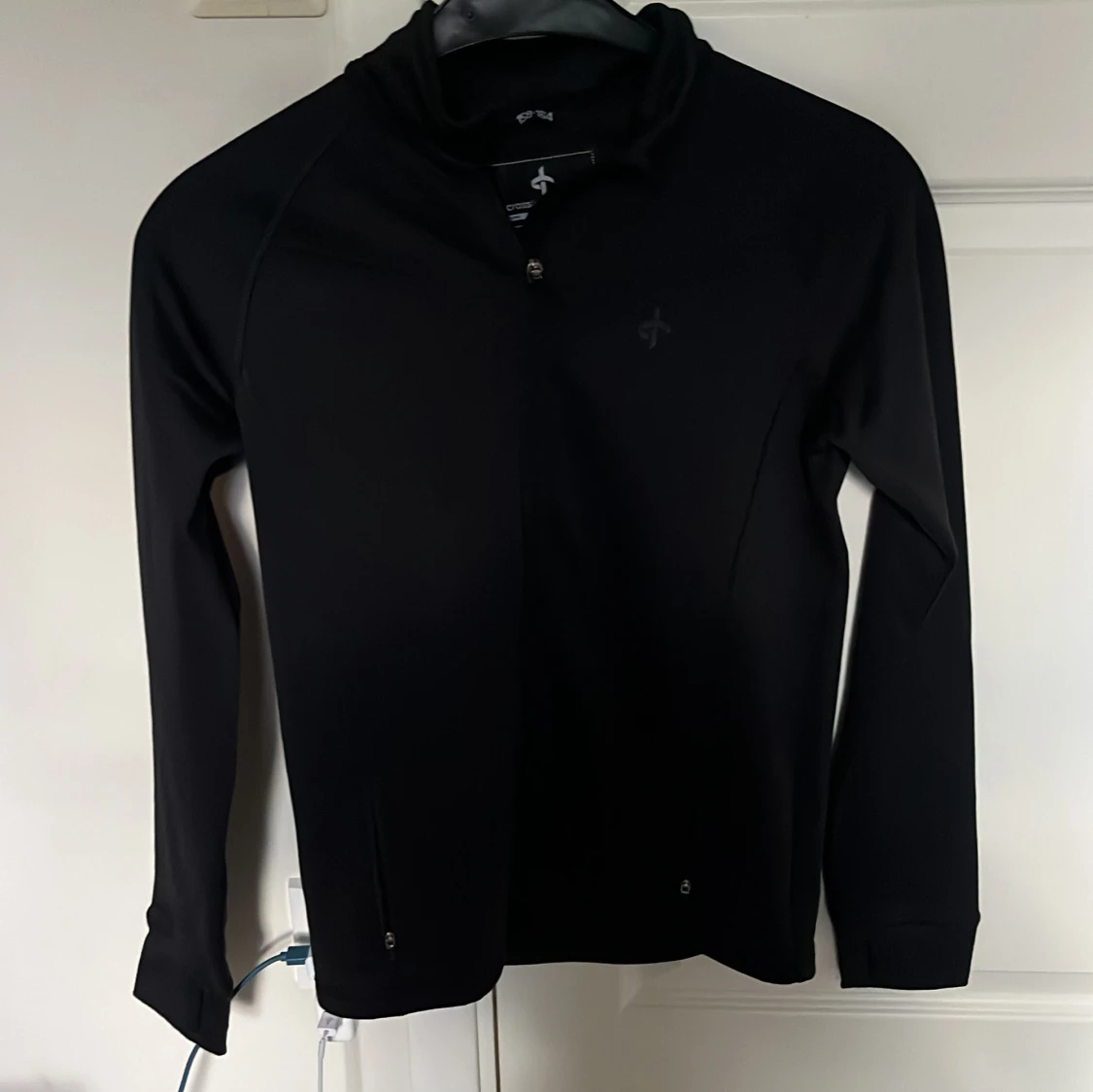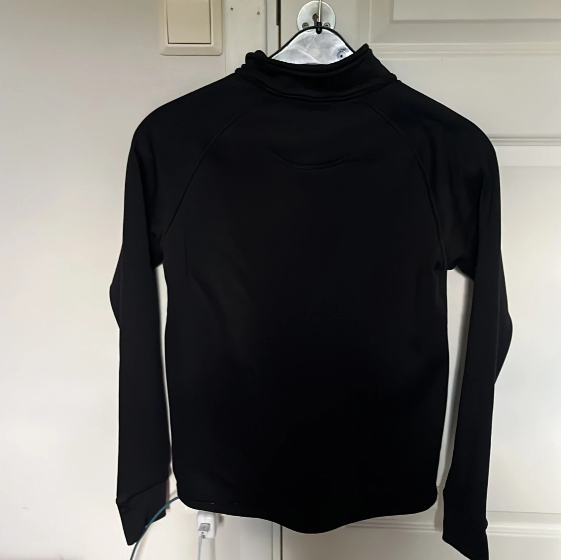 Svart långärmad sporttröja från Cross Sportswear med half zip framtill. Tröjan har en hög krage och är tillverkad i ett stretchigt syntetmaterial som passar perfekt för träning eller utomhusaktiviteter. Enkel och stilren design utan mönster.