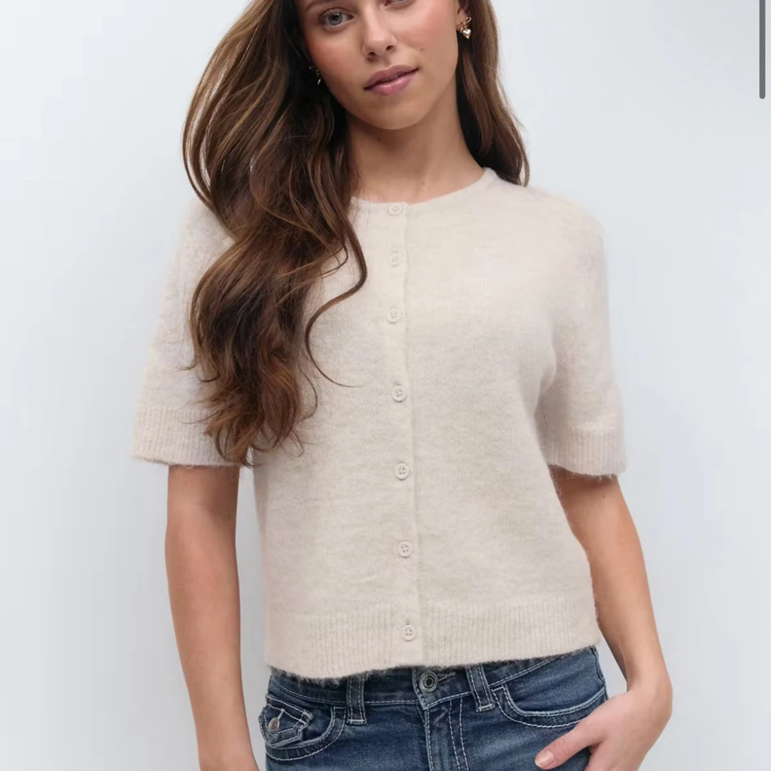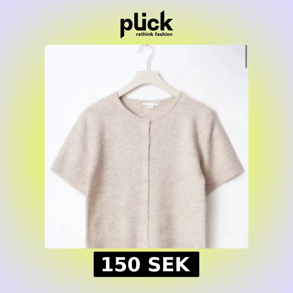 Kortärmad, beige stickad kofta från Gina Tricot med rund halsringning och knappar framtill. Mjuk och fluffig känsla som är stilren och passar till nästintill allt! Pris är diskuterbart!