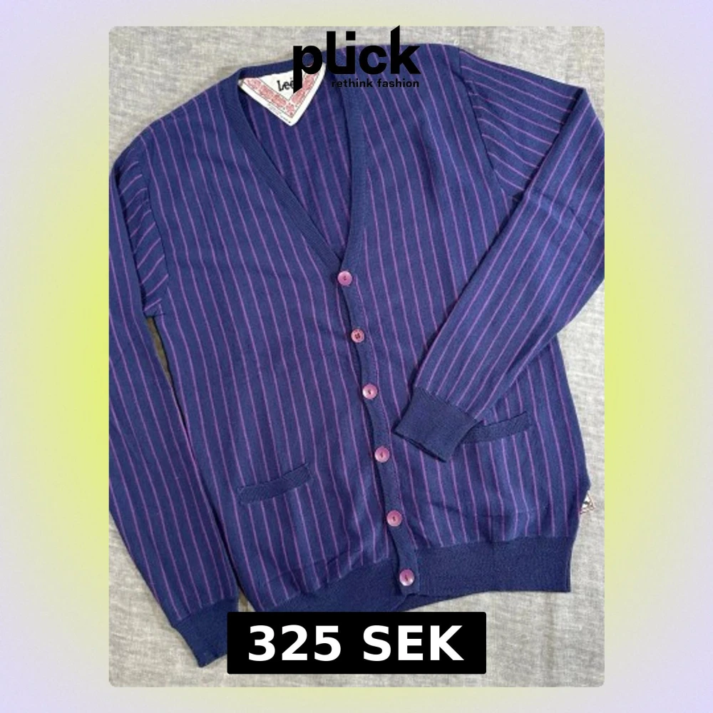 Description: lee wool cardigan in deep blue/purple with pink stripes. clean y2k/preppy vibe with a slim slightly cropped fit. easy layering piece with buttons + pockets. measurements (cm, laid flat): p2p 47, waist 34, s2s 42, length 47, sleeve 64.5 good vintage condition, light wear. colors may vary slightly due to lighting.