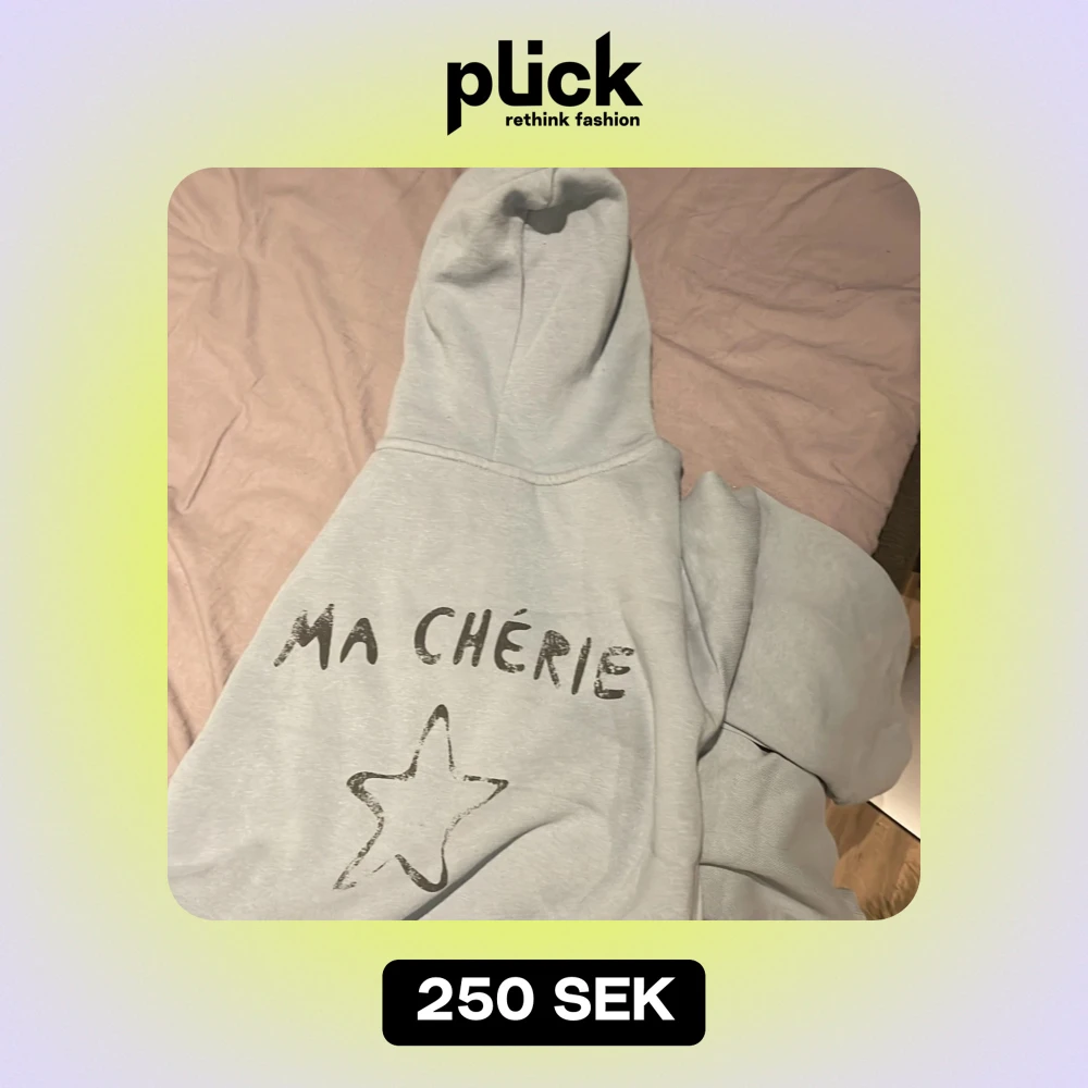 Säljer en supermysig grå hoodie från Gina Tricot med texten 'Ma Chérie' och en stjärna på framsidan. Perfekt för chilliga dagar eller när du vill vara bekväm men ändå snygg. Den har en klassisk huva och ribbade muddar. Passar perfekt till jeans eller leggings! Liten i storleken då de är storlek 166/152 säljer för 250