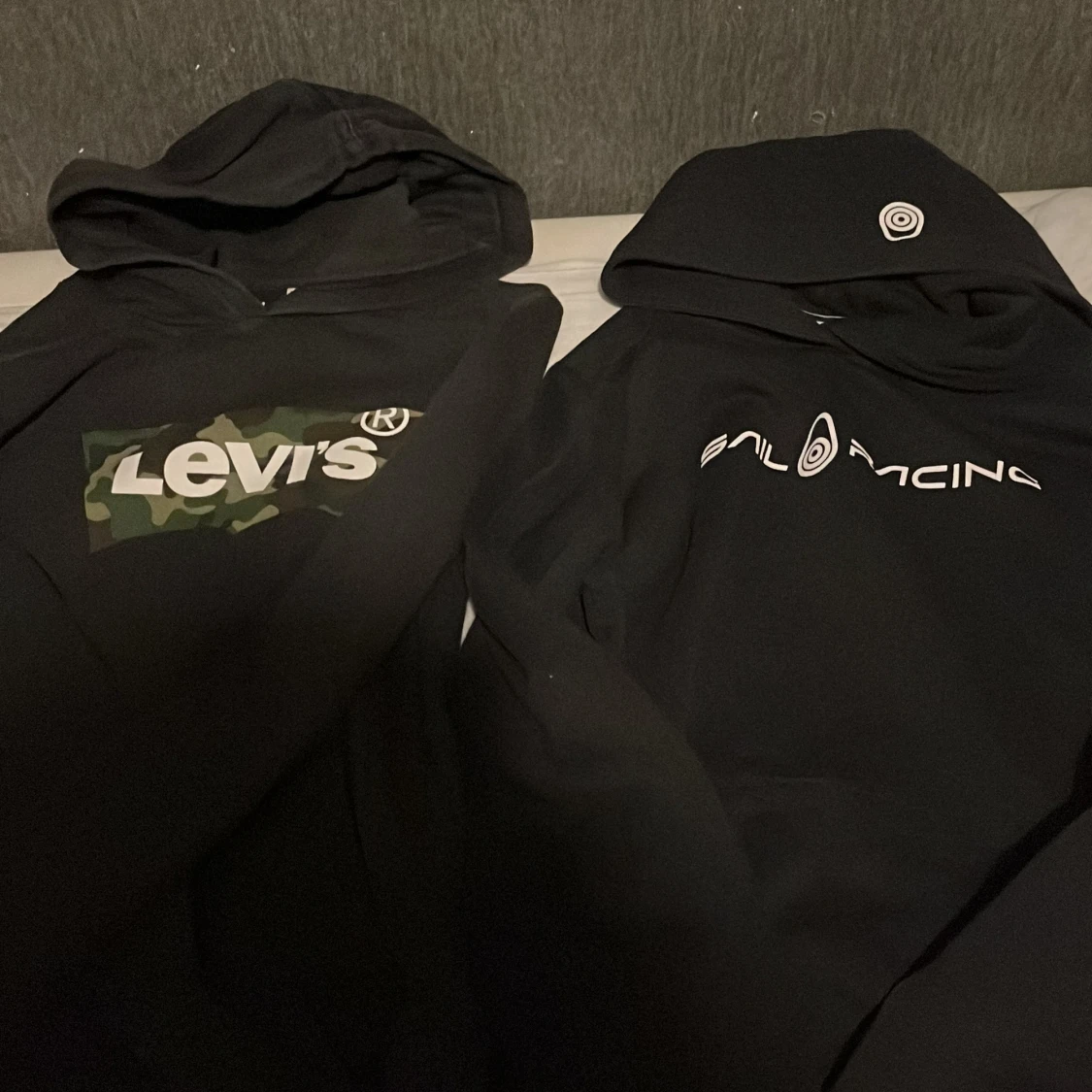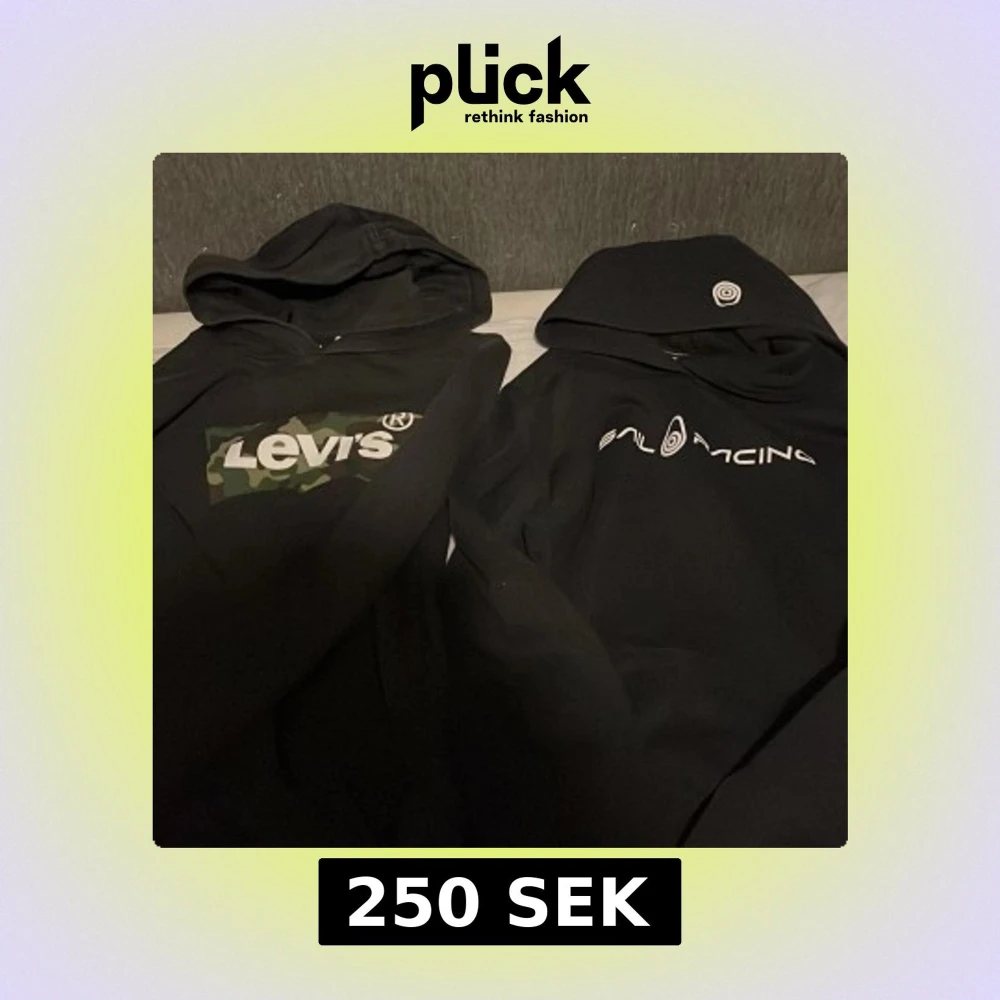 Superrrrr erbjudande båda för 250 kr eller en för 150 kr!!! Två snygga svarta hoodies, en från Levi's med kamouflagemönster och en från Sail Racing med stilren logga. Perfekta för en casual look.