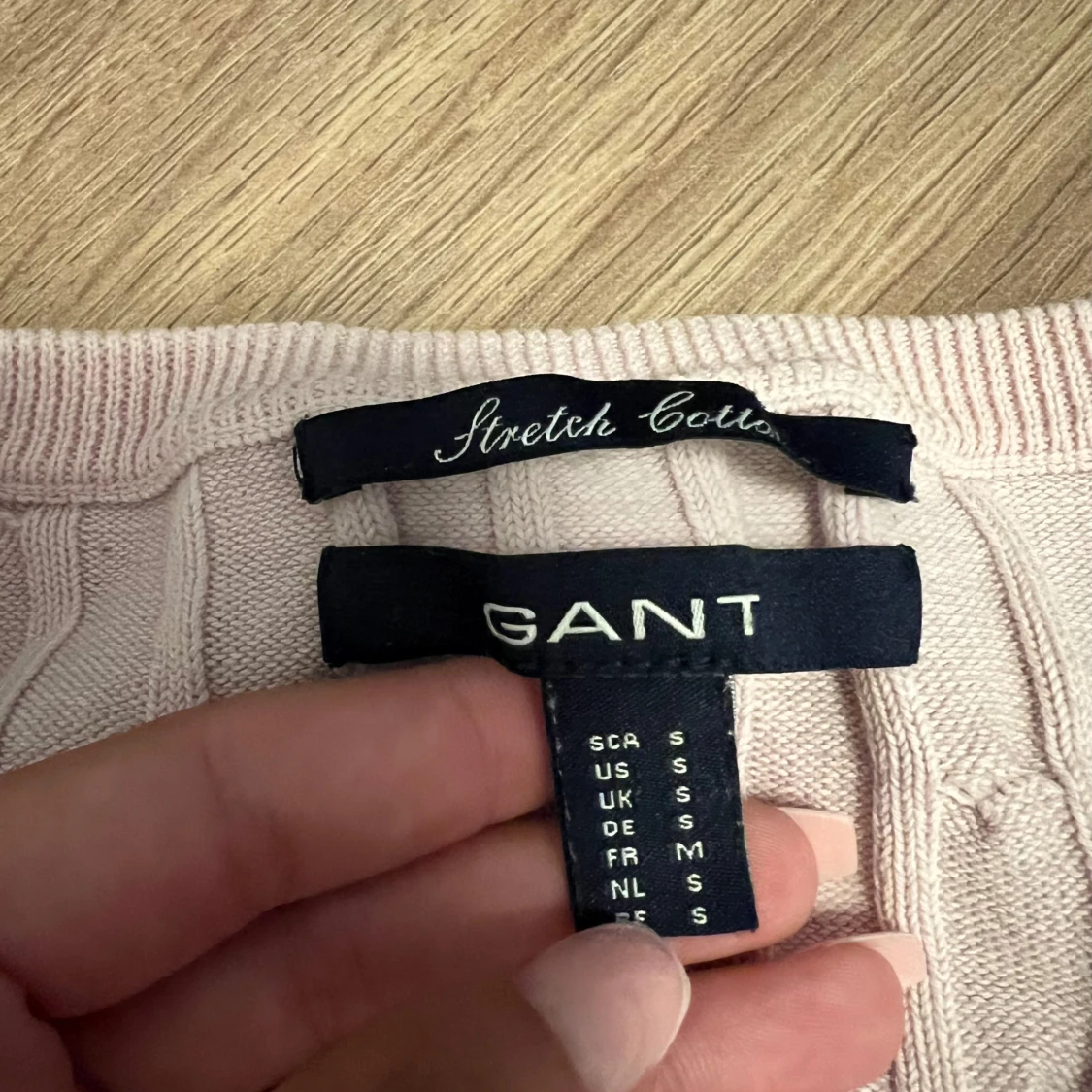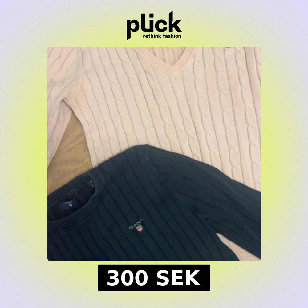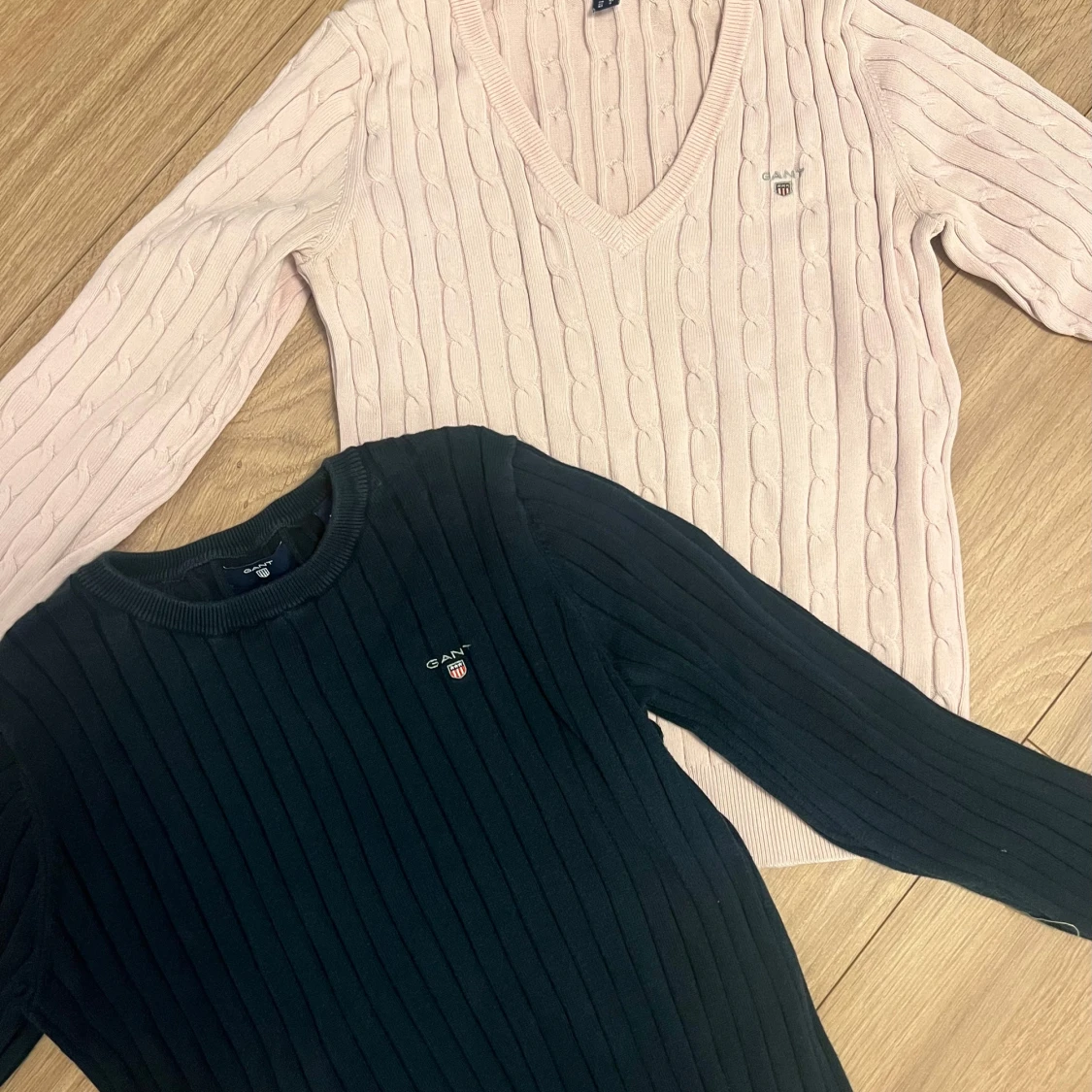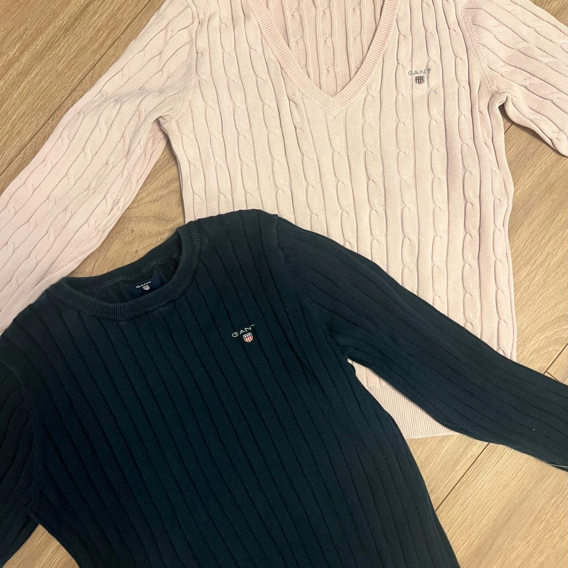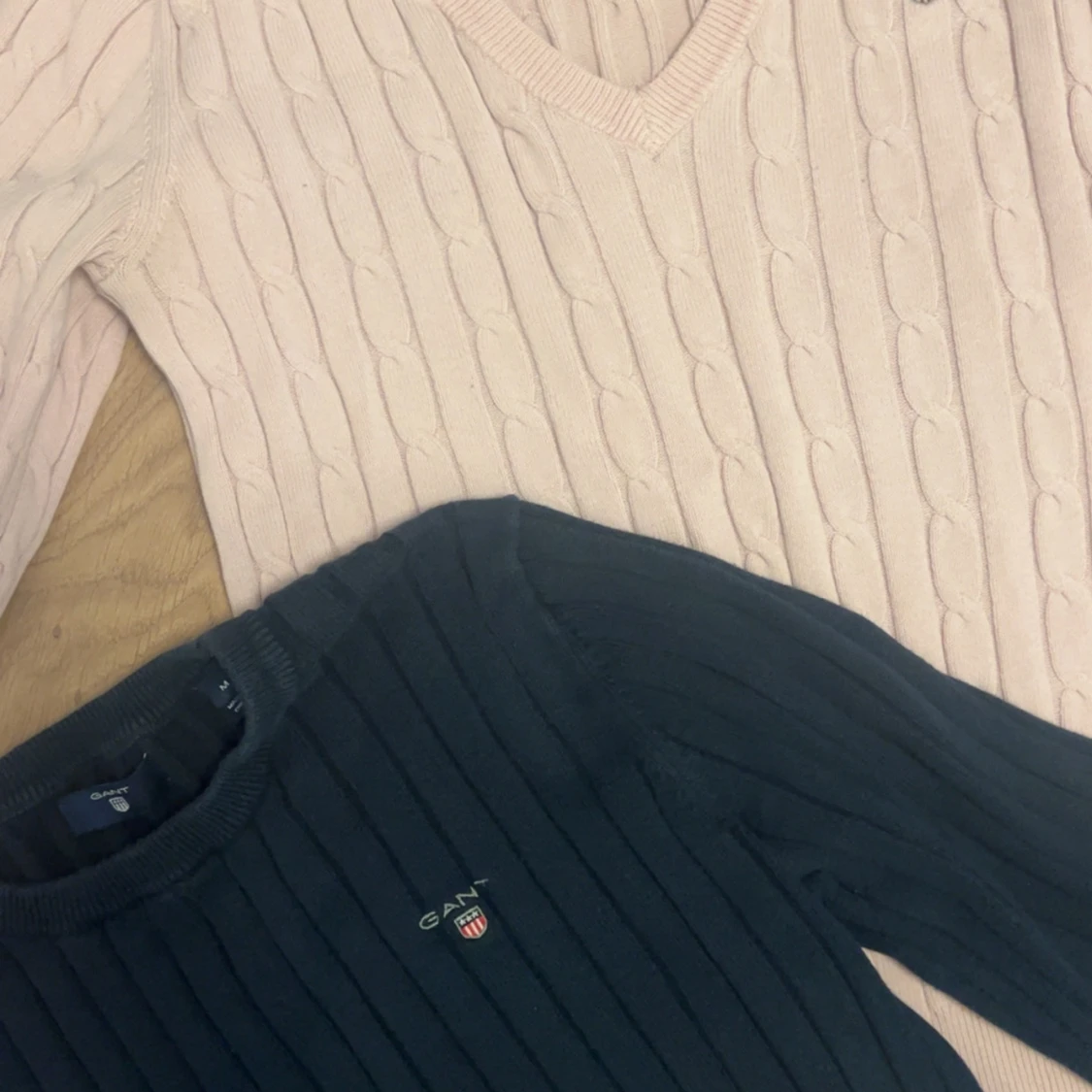 Två snygga stickade tröjor från GANT i storlek S och mörkblåa i M (men sitter som S). En ljusrosa kabelstickad tröja med v-ringning och broderad logga på bröstet, samt en marinblå ribbstickad tröja med rund hals och broderad logga. Båda i mjuk bomull med klassisk passform. Prister gäller båda två!